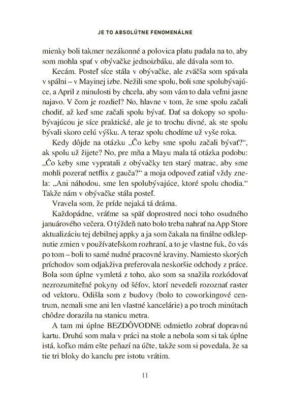 Skrátka, s April je to náročné a hoci som sa občas pristihla pri tom, že mi nesmierne lezie na nervy a inokedy som jej mala chuť dať do postele minimálne dikobraza, nedokázala som prestať čítať. Pretože staršia April, ktorá rozprávala príbeh mladšej April, ma neustále lákala na nadchádzajúce udalosti. Navyše to bolo celé napísané takmer až denníkovým štýlom, čiže April preskakovala z udalosti na udalosť a pohľad do jej hlavy bol niekedy zaujímavý.