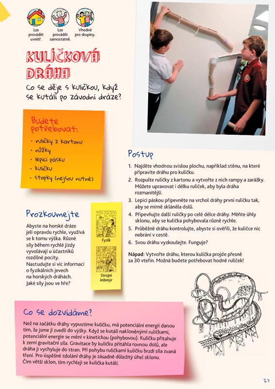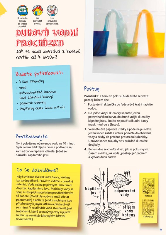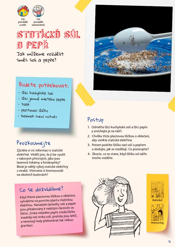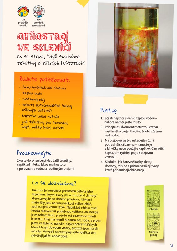 Každý pokus začíná otázkou a je jen na tobě najít správnou odpověď. Ale neboj, vždy je přiložen přehledný návod, takže úspěch je zaručen. Pracuje se s běžnými materiály, které najdeš doma nebo ve škole. Nechybí okénko se shrnutím toho, co díky pokusu můžeš zjistit, a také zajímavosti z praxe, například seznam povolání, jež řeší typově stejné problémy.
