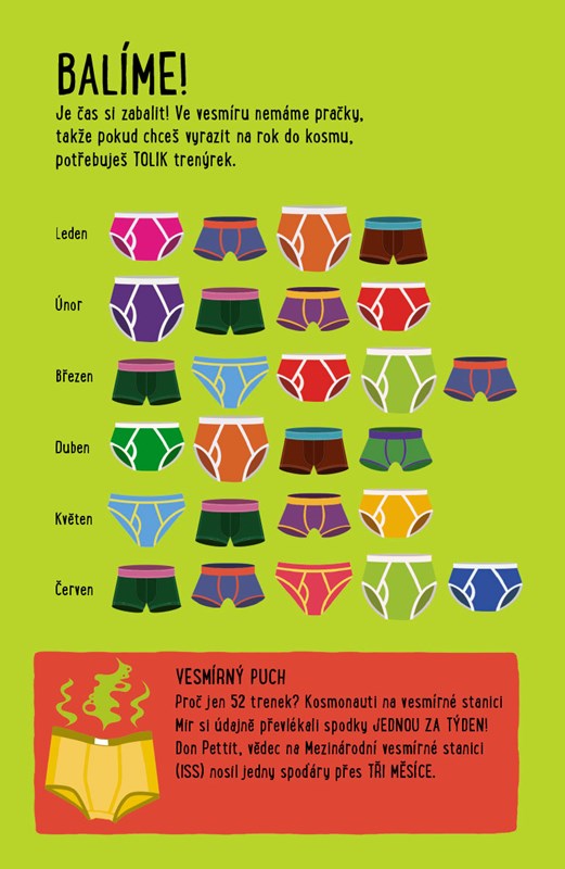 Zjistíš, jaké počasí je na planetě Pluto. Přečteš si, kolik tun odpadků zanechal člověk na Měsíci nebo kolik balonků naplněných héliem by tě vyneslo do nebe. Dozvíš se, kolik cesta do vesmíru stojí a jak chodí kosmonauti ve stavu beztíže na záchod.
