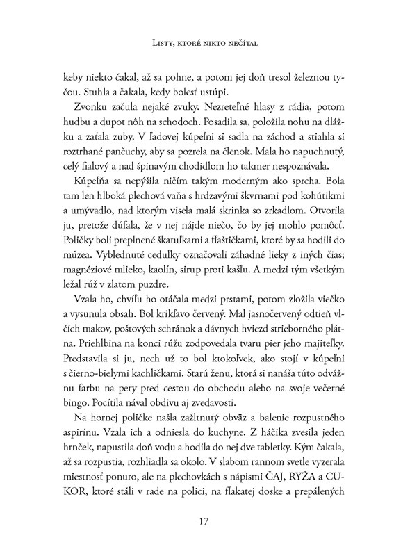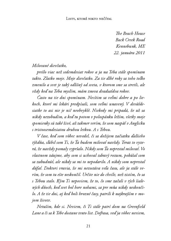 Keď som knihu dostala do rúk, mala som mierne obavy z jej hrúbky. Predsa len viac ako 400 strán. Ale viete čo, pokojne by som čítala aj ďalších štyristo. Kniha sa mi čítala veľmi dobre. Nielen kvôli striedaniu príbehov a listom, ale aj vďaka ľahkosti, s akou je napísaná. Myslím, že je vhodná ako darček pre ženu bez ohľadu na vek. Prídu si tu na svoje mladšie čitateľky, ale neurazí ani tie staršie. Pokiaľ máte rady romantické príbehy, tak tento určite stojí za prečítanie.