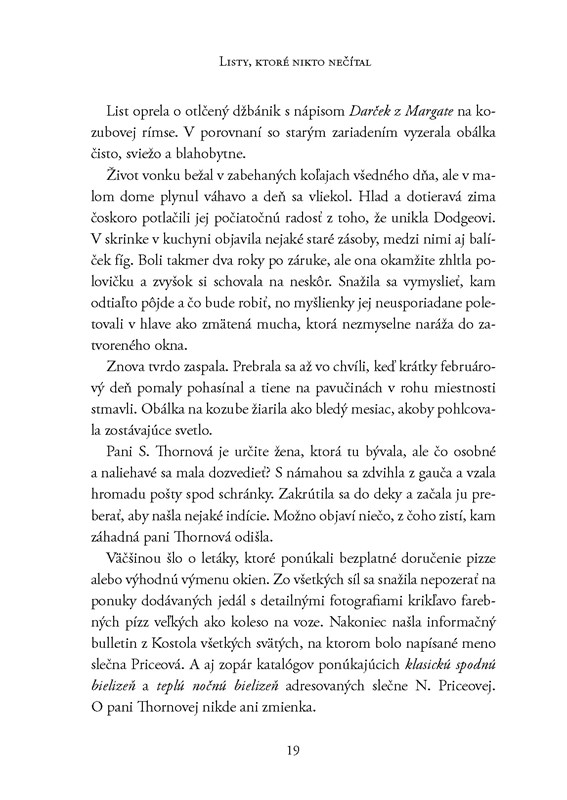 Kniha v sebe ukrýva dva príbehy. Jeden je z minulosti. Odohráva sa na pozadí druhej svetovej vojny. Ten druhý je súčasný. Mnohí už iste viete, že milujem striedanie príbehov v knihe. Človeka to núti čítať viac a viac a pritom sa dozvedá informácie, ktoré sa prelínajú a postupne celému príbehu dávajú zmysel. Čo však mám ešte radšej? Listy v knihách. Je to úžasné osvieženie jednotvárnych stránok. Navyše by sa mi veľmi páčilo, keby sa listy písali aj v dnešnej dobe. Viete si predstaviť ako sa museli cítiť nedočkavo, keď napísali list a museli čakať dni, týždne a možno aj mesiace na odpoveď? V dnešnej dobe odošlete správu a možno ešte v tej istej minúte vám príde odpoveď.