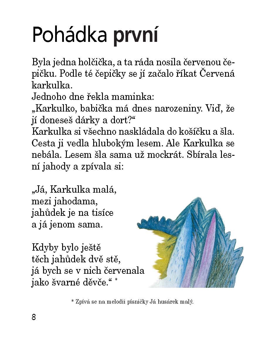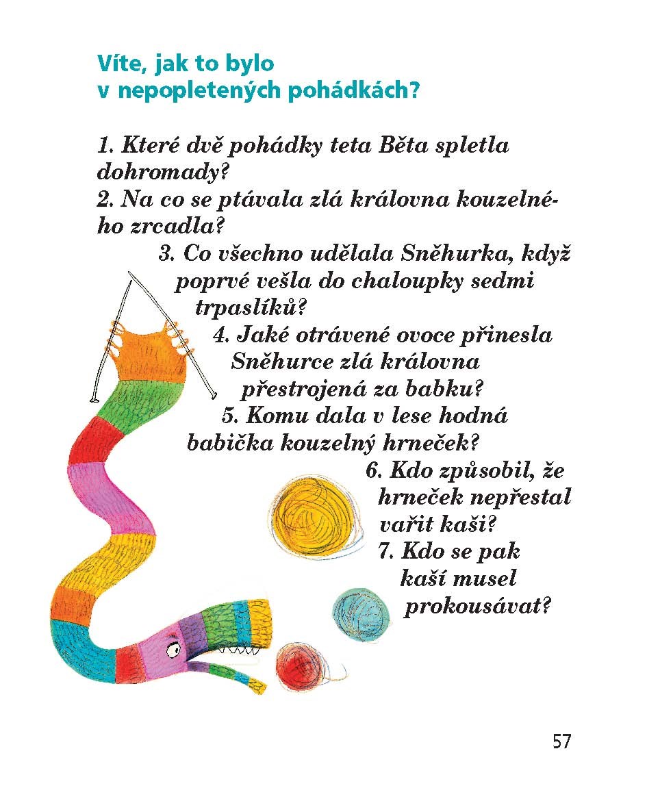 Teta Běta ráda plete. Svetry, čepice, rukavice i šály. A taky pohádky. Když se teta pustí do jejich vyprávění, nestačí Šárka s Vašíkem kulit oči. V tetiných pohádkách Červená karkulka potká v lese jelena se zlatými parohy, Popelka leze na strom a hledá světýlko, Sněhurka trpaslíkům vaří ze známého hrnečku kaši a probuzení Šípkové Růženky je přímo k neuvěření. Malí čtenáři si však na nich mohou skvěle vyzkoušet, jak dobře znají ta nejhezčí pohádková vyprávění. Přestože je všech osm na první pohled pěkně zamotáno v klubíčku, nevzniká zmatek nad zmatek, ale zábavné čtení pro začínající čtenáře. Vzhůru tedy do veselého rozplétání pohádkového klubka!