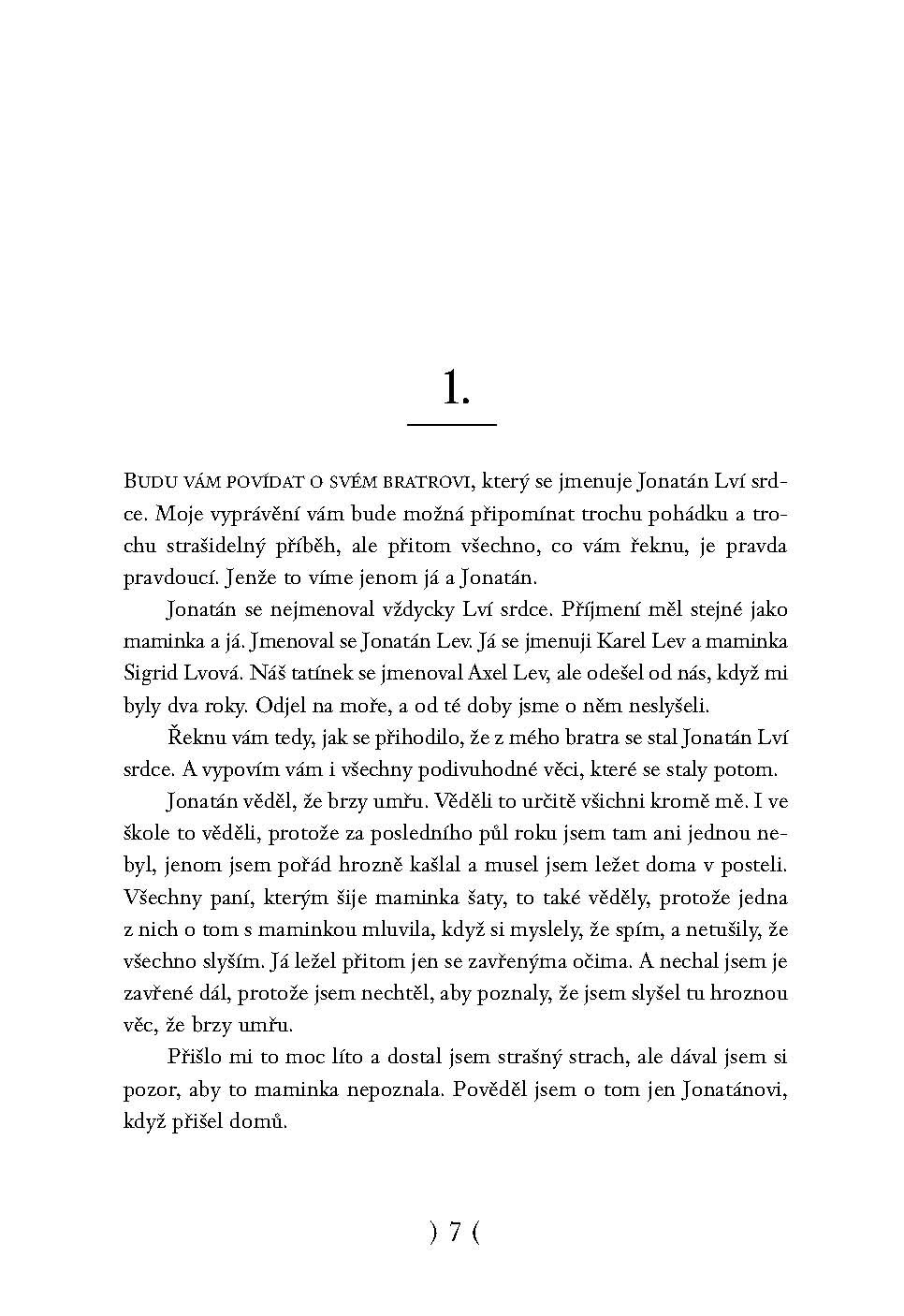 Krásný, nevídaný, strhující příběh odvahy, cti a věrného přátelství, které zvítězilo nad smrtí, zradou a nenávistí, prožili sourozenci Jonatán a Karel zvaný Suchárek. Až ho dočtete, pochopíte, že oba jsou skutečně hodni jména bratři Lví srdce.