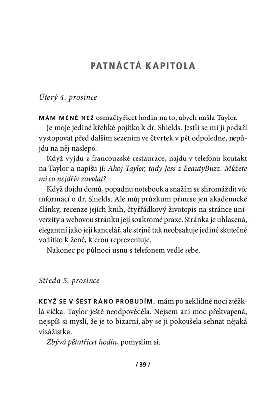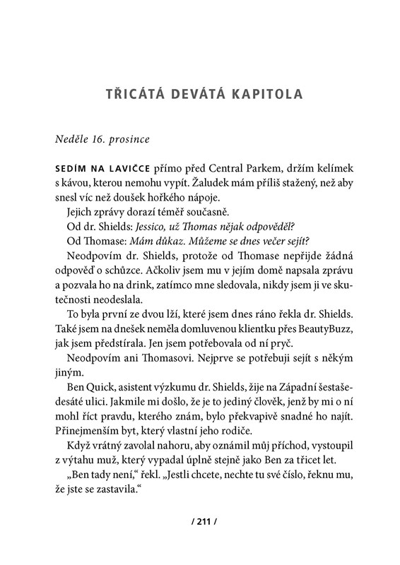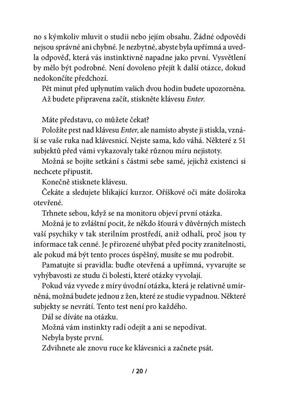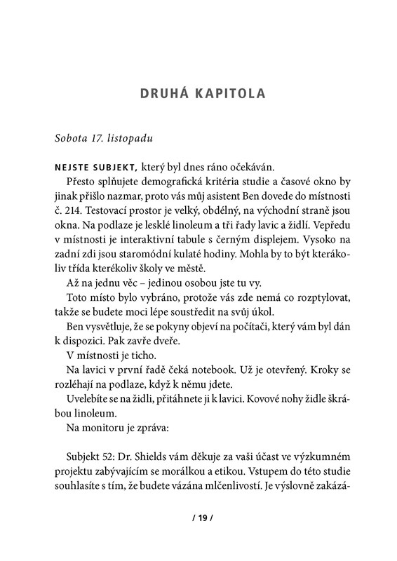 Podvodně se přihlásit do studie o morálce a etice možná nebylo správné – ale Jessice finanční odměna přišla vhod. Její anonymní dotazník zaujal, a tak následovaly další důvěrné otázky i setkání s doktorem Shieldsem, pokusy v reálném životě… A Jess začne váhat, zda bylo moudré prodat svá důvěrná tajemství. Hranice mezi skutečností a experimentem se stírá; už neví, kdy je sama sebou a kdy pokusným subjektem…