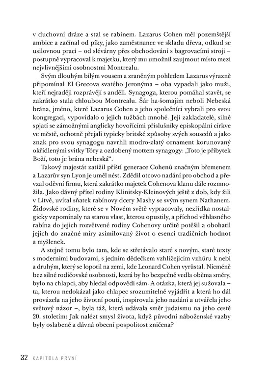 Liel Leibovitz pátrá právě po oné „nadčasovosti“ a hluboké pravdivosti, díky nimž má hudebník, spisovatel, filosof a básník Leonard Cohen nejširšímu publiku stále co říci. Je to snad dáno tím, že zůstal věrný prorockému vnímání, které je pro miliony lidí na celém světě hluboce pravdivé, a rovněž jeho obrovským charismatem, které dokázalo kdysi, v roce 1970, zkrotit zdivočelý statisícový dav na hudebním festivalu na ostrově Wight.
