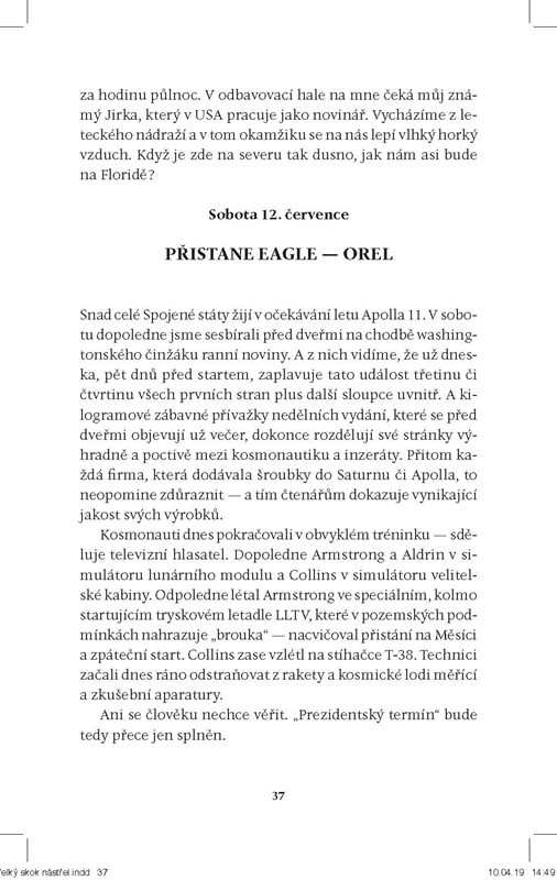 Lidem v Albatrosu jsem dodnes vděčný za to, že tuto knihu vydali. Bylo to od nich velice statečné, protože tlaky na republiku z Moskvy zesilovaly, a čtenáři – jak mně mnohokrát později vyprávěli – brali Apollo 11 jako vítězství svobodného světa nad komunismem. Bohužel prověrková komise na počátku sedmdesátých let sdělila některým nakladatelským redaktorům, že vydání mé knihy bylo hrubou politickou chybu, a přičetla jim to k dalším proviněním. Za to, co jsem jim způsobil, se jim dnes hluboce omlouvám, na druhé straně snad byl VELKÝ SKOK pro desetitisíce čtenářů povzbuzením do budoucnosti.“