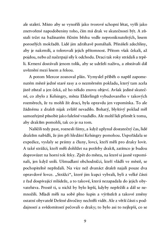 Pouť zubožených draků a jejich lidských průvodců pokračuje. Po Deštné řece směřují ke starodávnému městu Kelsingra – ztracenému domovu draků a tajemných Elderlingů. Čekají, že v něm najdou nové útočiště, kde budou platit jejich vlastní pravidla a zákony, které nebudou svázány žádnými předsudky. Je ale Kelsingra skutečná? Není to pouhý střípek naděje skrytý hluboko v dračí paměti?