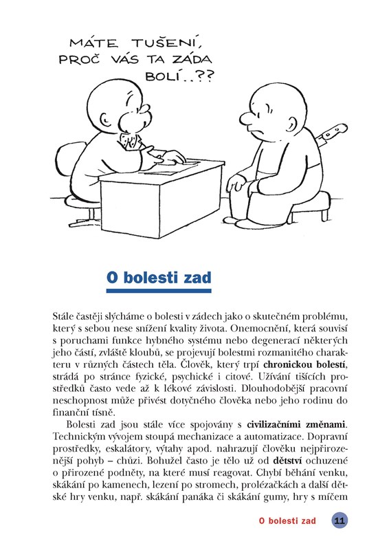 S předmluvou MUDr. Jana Hnízdila. Vzhledem k sedavému životnímu stylu se dnes bolest zad stala skutečným problémem, neřkuli civilizační chorobou. Nezbývá než pomoci si osvědčeným prostředkem – speciálním cvičením. K tomu nám pomůže brožurka cviků podle osvědčené metody paní Mojžíšové, kterou sestavila zkušená fyzioterapeutka dr. Simona Sedláková.