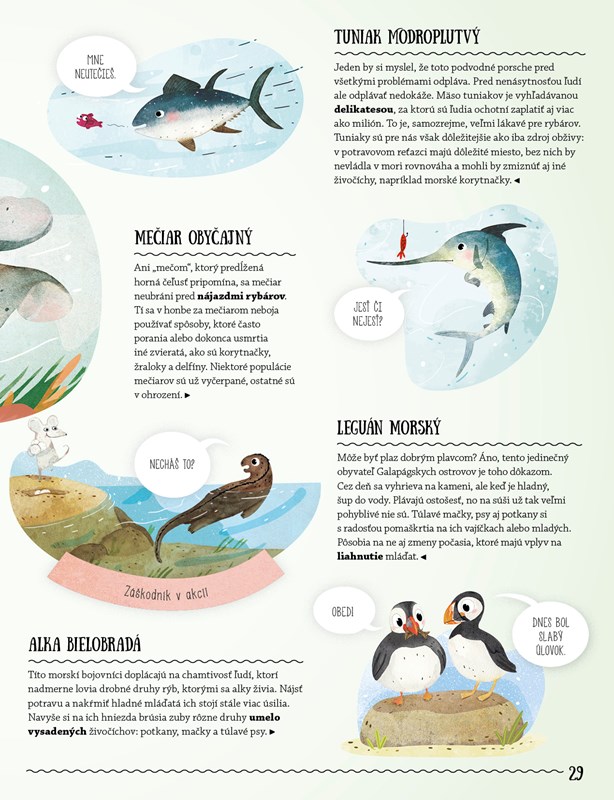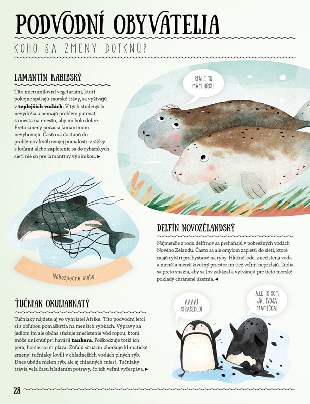 Ďalšie strany sa už venujú siedmym oblastiam, kde sa ohrozené živočíchy nachádzajú. Kniha tak deti prevedie polárnymi oblasťami, ale aj púšťami. Zistia, prečo sú dôležité pralesy, hory aj trávnaté oblasti. A samozrejme sa ponoria aj pod hladinu oceánu a nazrú aj na korálové útesy. O každej jednej oblasti sa dozvedia všeobecné informácie a čím sú ohrozené. K tomu všetkému sú pridané aj konkrétne živočíchy, ktoré sú na pokraji vyhynutia. Čo sa mi však páči je fakt, že vždy je napísané, ako by sa tomuto stavu dalo predísť.