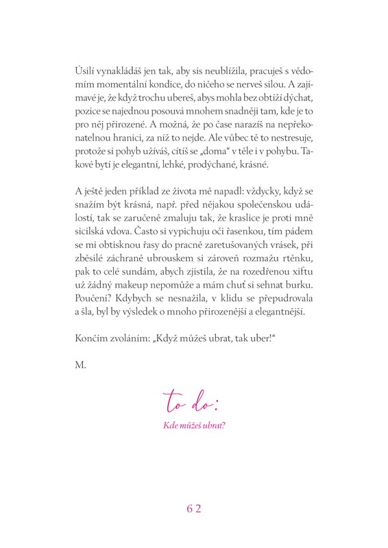 Je ti padesát, což není šestnáct, a máš pocit, že jsi stará, život skončil a čeká tě už jen cesta pouští všednosti do hrobu. Tělo bolí, kůže povoluje, nezdá se, že by svět byl ústřice, která se nechá jen tak vysrknout. Zkrátka, není lehké nacházet motivaci vyskočit ráno z postele a s úsměvem na rtech čelit realitě. Na druhé straně, je pořád dost věcí, které za to stojí. Jsou jiné, než když nám bylo dvacet, ale zato jsou prověřené časem.