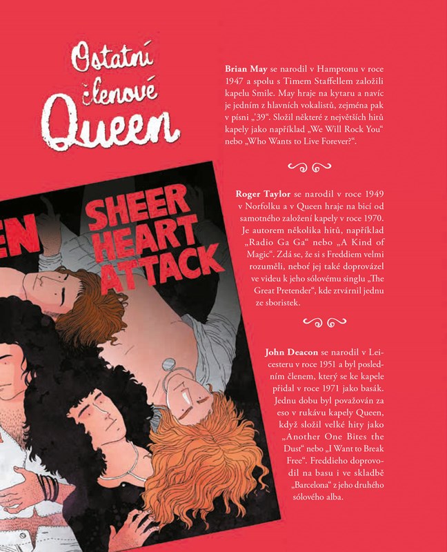 Kdo z nás si někdy v životě nezazpíval „We Are the Champions“? Koho nevtáhly procítěné tóny a propracovaná různorodost „Bohemian Rhapsody“? Skupina Queen zasáhla do života několika generací a doslova proměnila tvář populární hudby. Nápaditě ilustrovaná biografie vás provede životem frontmana Freddiho Mercuryho od jeho narození na Zanzibaru, přes světová pódia a nespoutané večírky až po boj s tehdy ještě neznámou nemocí AIDS.