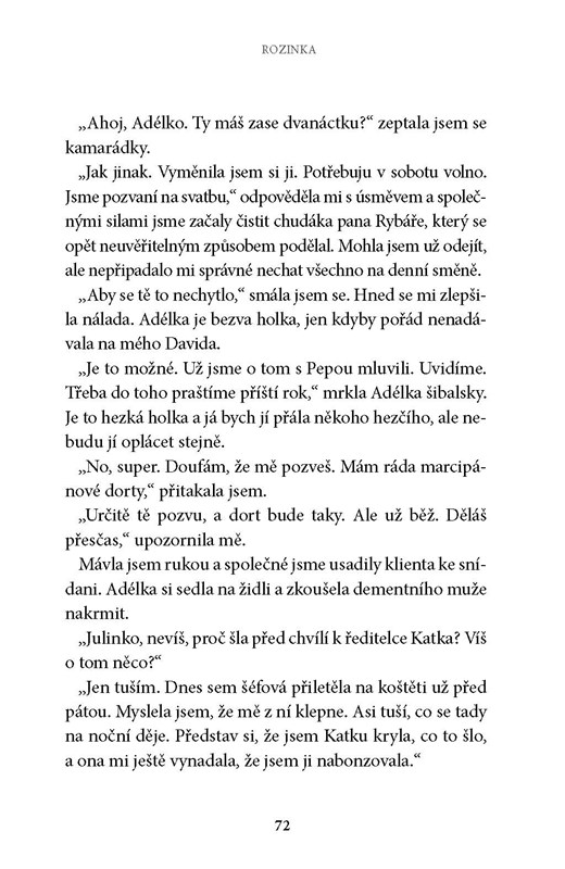 V rámci svojí práce vyslechne Julie spoustu příběhů lidí, kteří už toho už zažili opravdu dost, leckdy byli vystaveni i těm nejtěžším výzvám… Mladá žena přemýšlí nad mnoha lidskými osudy a jejich průběhem… Zjišťuje, že není až tak jednoduché odlišit dobro od zla. Nelehké osudy jejích „svěřenců“ jí vlastně nakonec pomáhají v nasměrování vlastního života… Přičemž největší radostí i oporou se pro ni stává černý mopslík jménem Rozinka…