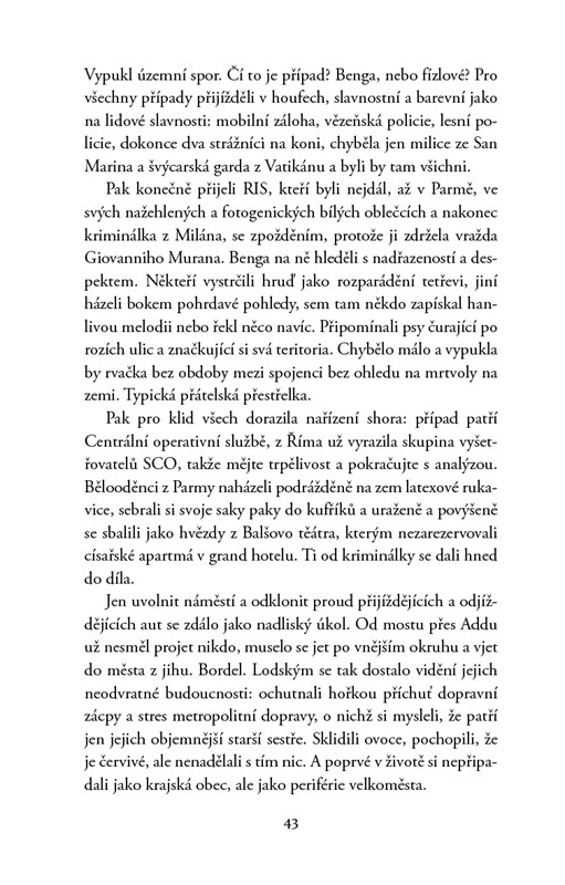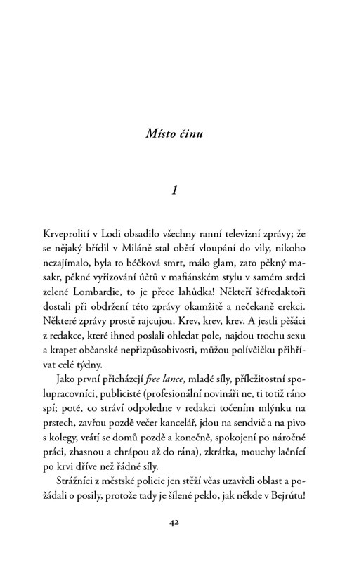 Sympatický smolař a schopný detektiv Ferraro se vrátil do Milána. V Římě zanechal komisařku Elenu Rinaldiovou, další nevydařený románek. Vrátil se osamělý a poražený na komisařství do chudé čtvrti, kam ho vážou vzpomínky z dětství. A čeká ho práce: přepadení ve vile s tragickou dohrou. V témže okamžiku končí jeden krkolomný útěk z věznice v krvavé lázni. Uprchlík je bezvýznamný černoch. Proč ho přišlo osvobodit mafiánské komando? Jaká je minulost záhadného muže? Ironií osudu bude Ferraro řešit tuto otázku právě s Elenou Rinaldiovou. Gianni Biondillo, mistr thrilleru, nás bere na divokou road movie při pronásledování zločinu napříč Itálií. Líčí současný detektivní příběh, který loví v těch nejtemnějších vodách strachů, jež sužují dnešní Itálii, a nabízí nám přesný a podrobný obrázek země a zároveň nastiňuje temné pozadí obchodu s africkými utečenci. Nikdy ale neztrácí humor a naději.