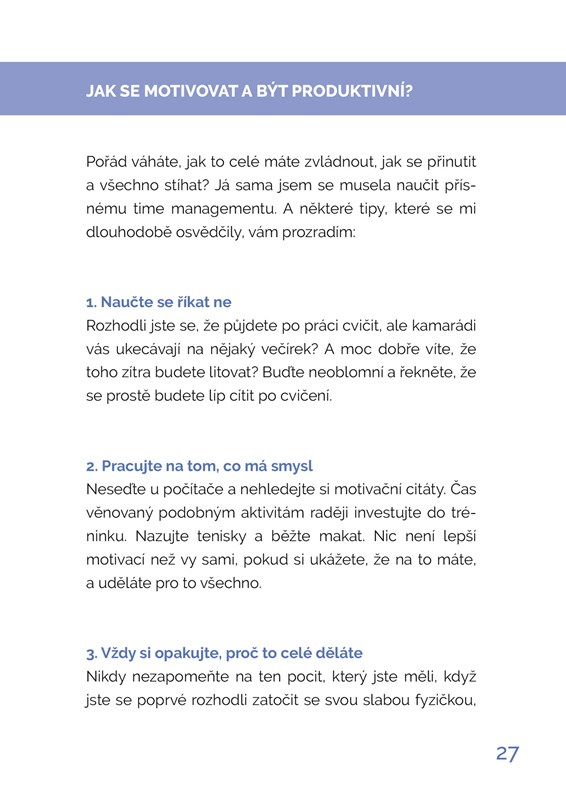 Právě držíte v ruce dílo autorky úspěšného českého fitness programu – FITFAB Strong. Jejím cílem je nejen zvednout Čechy z gauče a naučit je pohybu s radostí, ale především přimět je zdravě přemýšlet, kriticky hodnotit a spokojeně žít.