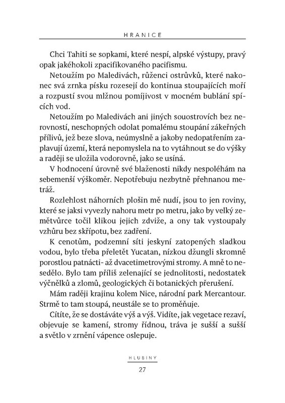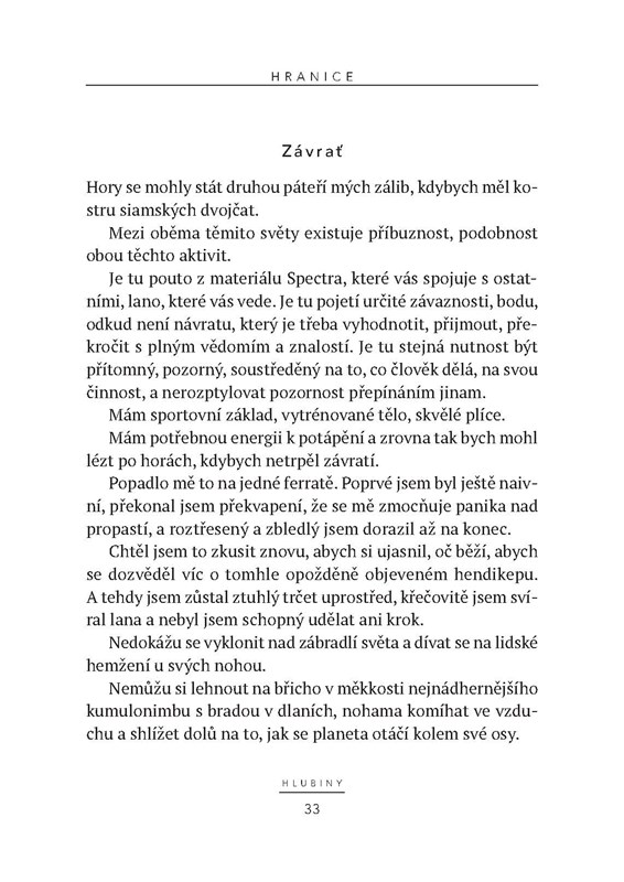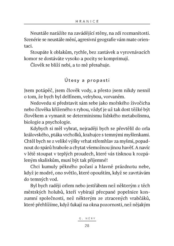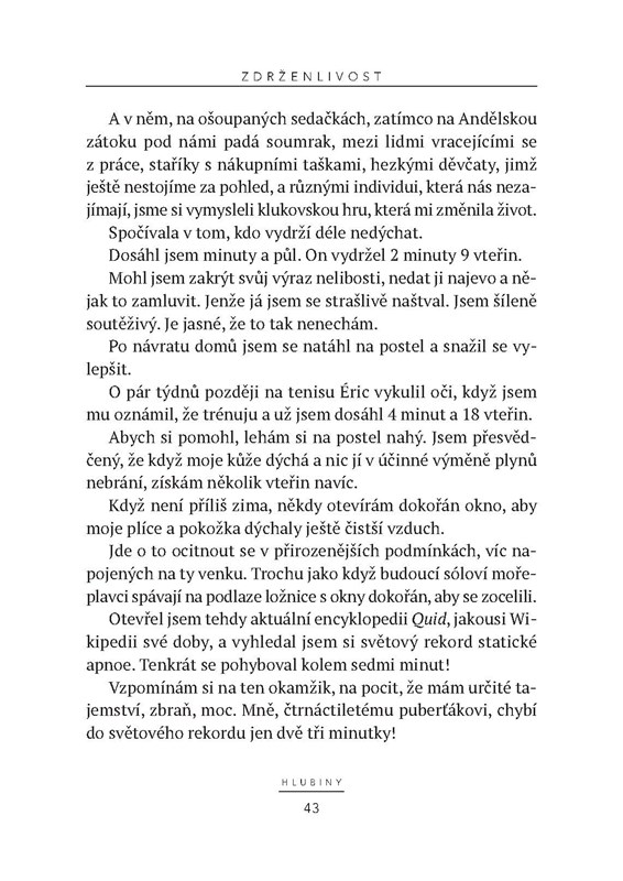 Kniha slavného potápěče nám umožňuje ponořit se do jeho tréninku, výkonů, technických obtíží, které musí překonávat. Potápění je pro něj víc než sport, je to životní filozofie, způsob, jak se přiblížit sám sobě i jak zkoumat oceán, který je dosud tak málo poznaným šestým světadílem. Tato neobvyklá pouť nás dovede na hranice lidských možností.