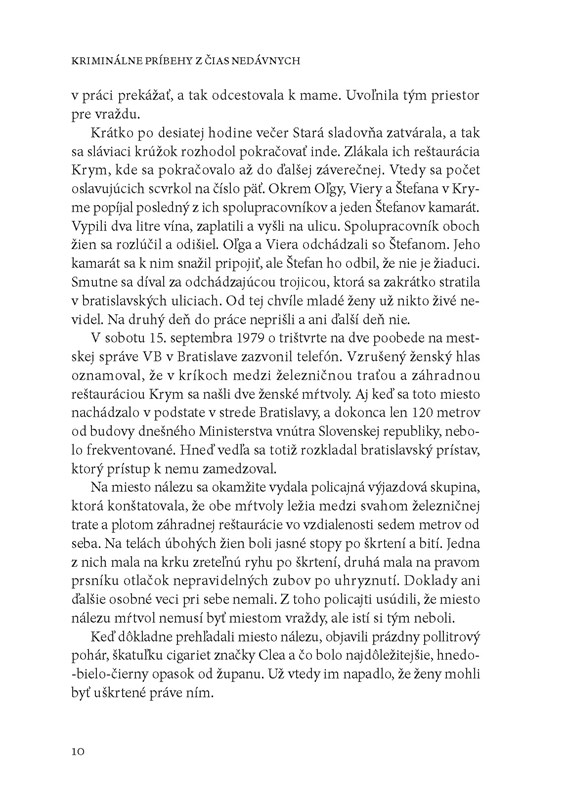 Nechajte na seba dýchnuť minulosť z jej odvrátenej strany. Znovu sa začítajte do prípadov z hlavných novinových titulkov, napríklad do kauzy Ľudmily Cervanovej alebo prípadu „fantóma“ Jozefa Slováka, no chladnými vás nenechajú ani tie menej známe, ktoré autor prerozprával s napínavou atmosférou. Vo svojej knihe odkrýva pozadie najznámejších i menej známych kriminálnych prípadov, ktoré otriasli pokojným životom obyvateľov Československa. Ich aktérmi sú chladnokrvní vrahovia, rozkrádači, zlodeji, žiarliví či bezcharakterní násilníci. Ukážu vám však, že zločinné myšlienky sa nerodia iba v hlavách ľudí zo sociálnej spodiny. Rovnako dobre sa na šikmé chodníčky môžu dostať otcovia slušných rodín, naoko milujúci manželia alebo spoločensky vysokopostavení jedinci.