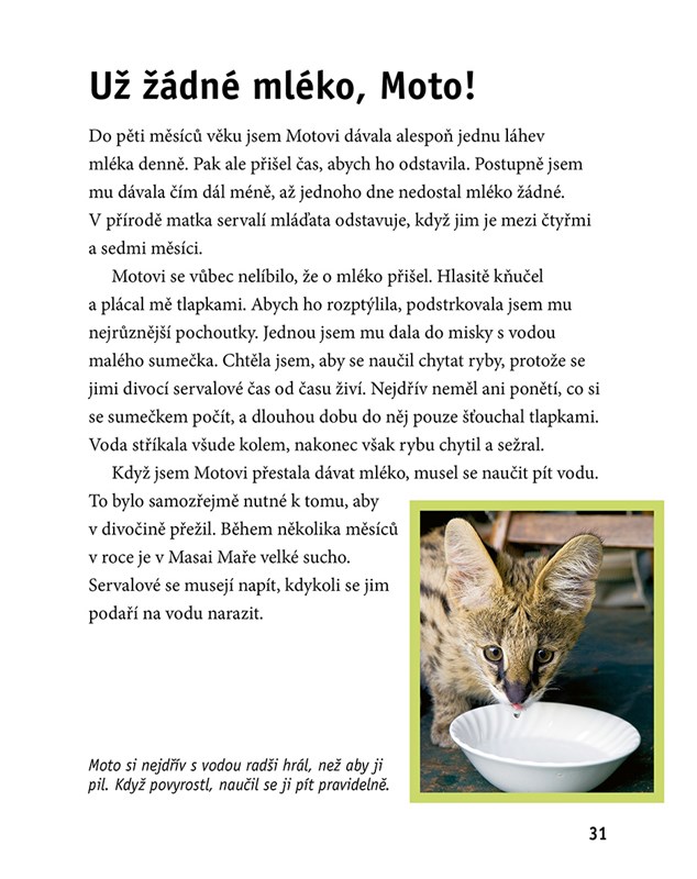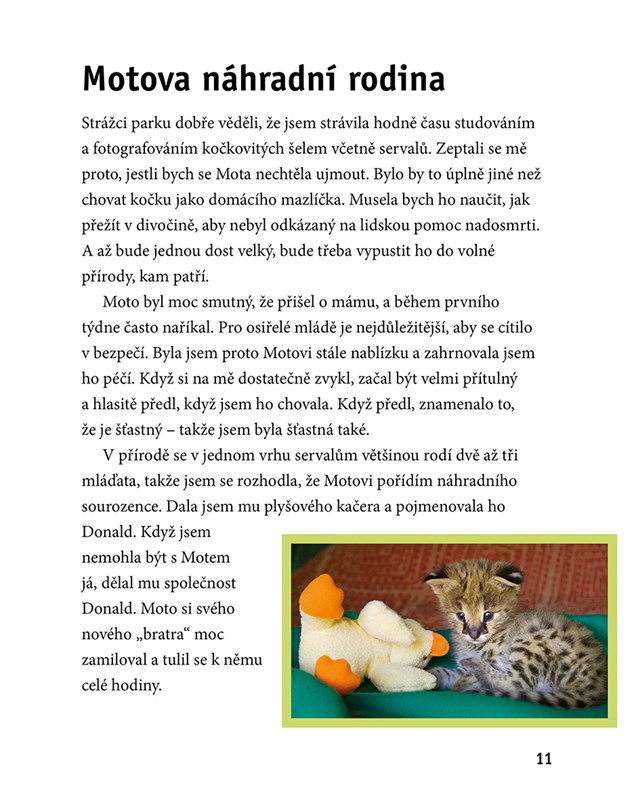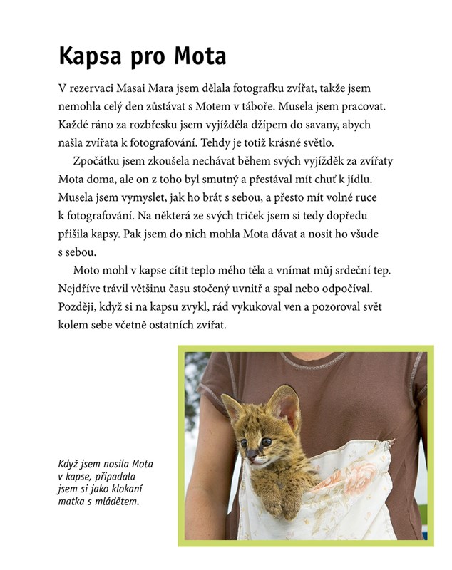 Když Suzi jako dítě snila o tom, že bude bydlet ve stanu v Africe, nikdy jí nepřišlo na mysl, že se stane kočičí mámou dvoutýdenního mláděte servala. Přesně to však skoro rok dělala, když ji strážci rezervace poprosili, aby vychovala Mota.