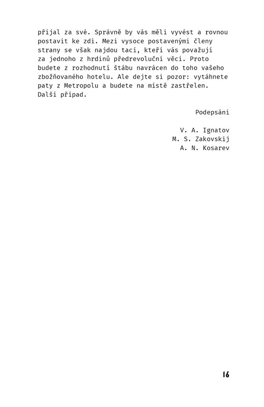 „Vytáhněte paty z Metropolu a budete na místě zastřelen,“ zní doživotní rozsudek bolševického tribunálu nad hrabětem Alexandrem Iljičem Rostovem za autorství „nebezpečné“ básně. Tak začíná strhující příběh klenoucí se od vzniku Sovětského svazu přes Velkou vlasteneckou válku až po nástup Chruščova k moci.
