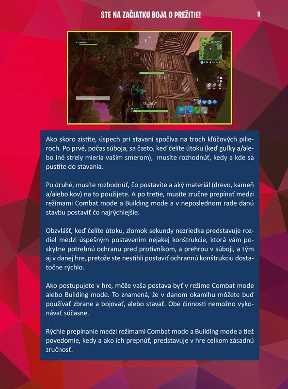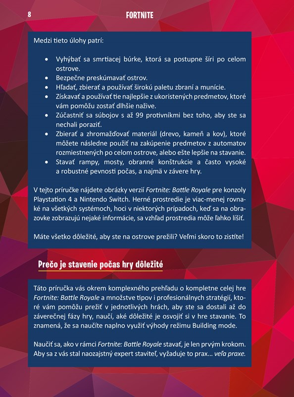 V knihe Fortnite: Stavaj ako profík nájdete najlepšie stratégie a tipy od skúseného hráča. Naučte sa využívať najoriginálnejšiu hernú mechaniku Fortnite: stavbu múrov a ďalších štruktúr. Dozviete sa, ako správne postaviť a rozvrhnúť svoju pevnosť, kam ju umiestniť a aký materiál najlepšie použiť na stavbu. Okrem toho v knihe nájdete veľa ďalších tipov, ako využiť geografiu ostrova na vlastnú obranu, šetriť stavebnými materiálmi alebo používať Epic Store.