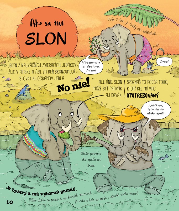Nielenže vyzerá ako niečo medzi bobrom, kačicou a vydrou, ale navyše nemá ani žalúdok. Chudák vtákopysk! Čo asi teda je? Určite toho nezje toľko ako slon, ktorý môže zožrať za jediný deň až tristo kilogramov potravy. Len pre tvoju predstavu, toľko vážia napríklad tri čerstvo narodené sloníčatá. Svet zvieracích jedákov je skutočne pozoruhodný. Nahliadni doň so svojou prvou obrázkovou knižkou o zvieratách a zisti, ako zvieratá jedia.