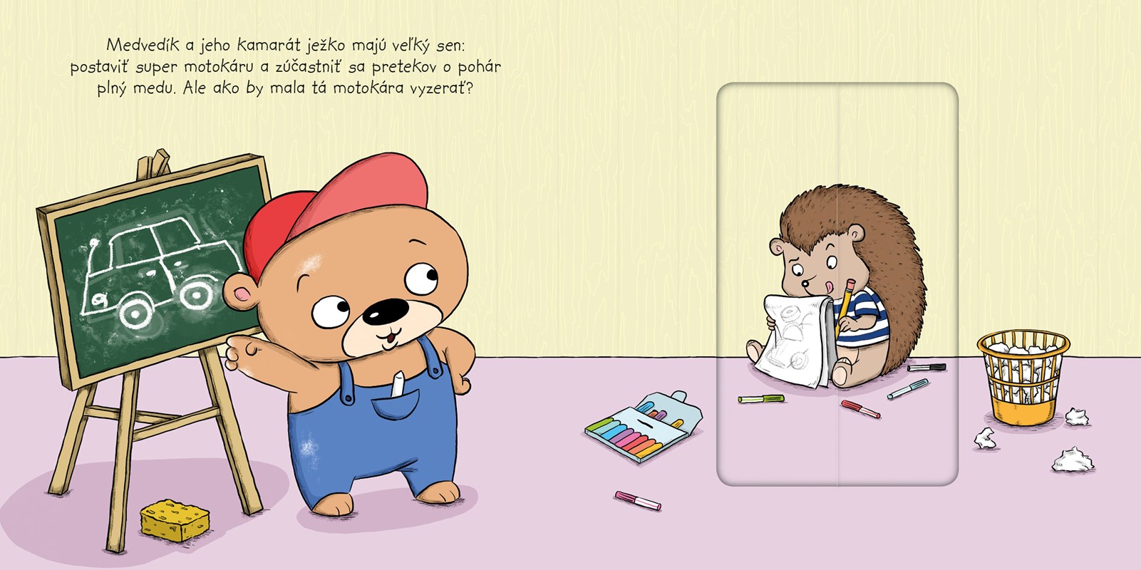 Ako sa stavia motokára? Potrebujeme drevo, meter, pílku, vŕtačku, kolesá, skrutky, volant, skrutkovač… Uf, medvedíka čaká kopa práce! Pomôže mu vôbec niekto? Ale samozrejme, že áno! Nielen medvedík, ale aj jeho kamarát ježko sníva o tom, že sa raz zúčastní pretekov o pohár plný medu. Tak im drž palce, aby sa im tú motokáru podarilo postaviť. A nezabudni na čarovné ťahadlo! Vďaka nemu sa ti obrázky budú meniť priamo pred očami!