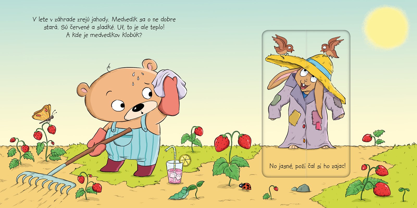 V lete v záhrade zrejú jahody. Medvedík sa o ne dobre stará. Sú červené a sladké. Uf, to je ale teplo! Kde je medvedíkov klobúk? A kto mu zjedol mrkvu? Vydaj sa s medvedíkom a jeho kamarátom zajacom do záhrady. Zažiješ s nimi kopu zábavy! Vďaka zázračnému ťahadlu sa ti obrázky budú meniť priamo pred očami.