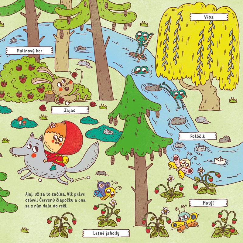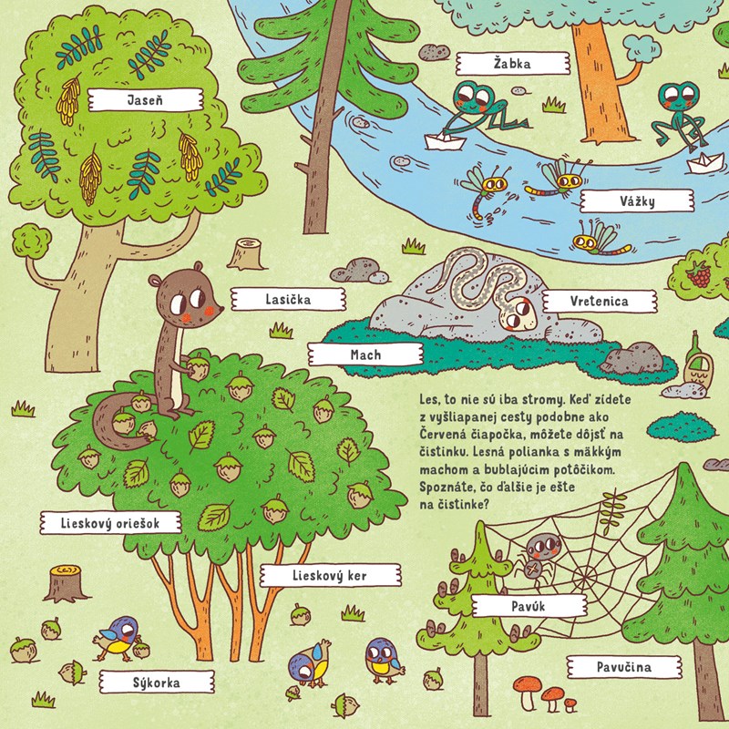 Jedného dňa sa vydala Červená čiapočka za babičkou. Musela ísť sama a cez hlboký les. Stretla síce vlka, ale spoznala aj veľa vecí, ktoré robia les lesom. Huby, stromy, zvieratká, sladké dobrôtky. Stopy lesa objavila aj v útulnej babičkinej chalúpke. Príroda je skrátka všadeprítomná a dôležitá. Chcete sa aj vy naučiť spolu s dievčatkom v červenom všetko o lese? Vezmite si košíčky s bábovkou, obujte si pohodlné topánky a poďte s nami. Zísť z cestičky je povolené!