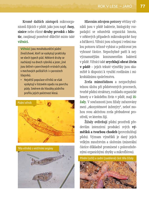 Lesy mají pro existenci života na naší planetě zcela nezastupitelné místo. V této knize se dozvíte nejen o jejich vzniku a významu, ale také o rozmanitých organismech, které v těchto ekosystémech pobývají a žijí. Prostřednictvím 600 unikátních fotografií nahlédnete v průběhu čtyř ročních období do tajuplných dějů pod zemí, ale i na zemi nebo v korunách stromů. Původní fotografie a textový doprovod vám pomohou přiblížit představu o tom, jaké organismy v našich lesích žijí a jaké jsou jejich vzájemné vztahy. Seznámíte se tak nejen s řadou známých živočichů, rostlin a hub, ale i s těmi tvory, o jejichž existenci nemají mnozí z nás ani tušení.