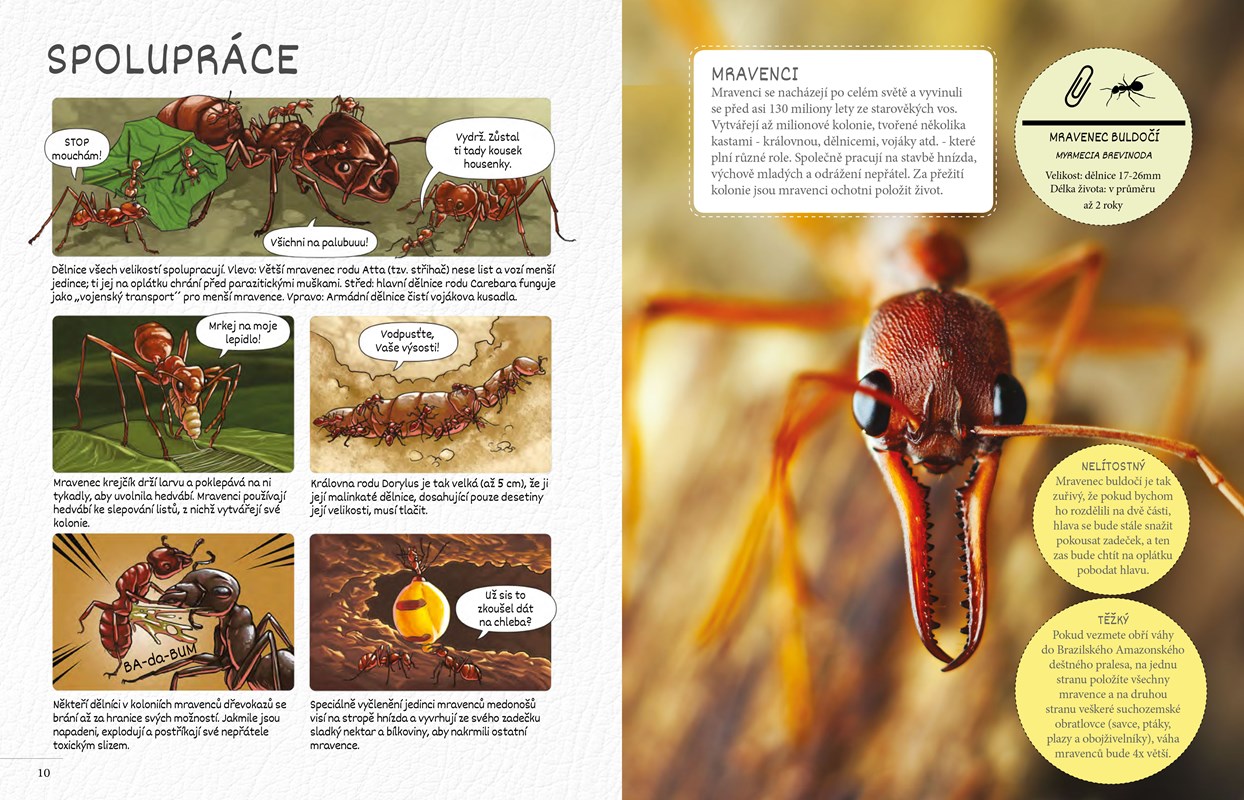 Příběhy mravenčích armád, lupenitek (které byly dříve považovány za chodící listy), termitů stavějících věže a blikajících světlušek jsou vyprávěny prostřednictvím ohromujících fotografií, zábavných komiksů a záživného textu.