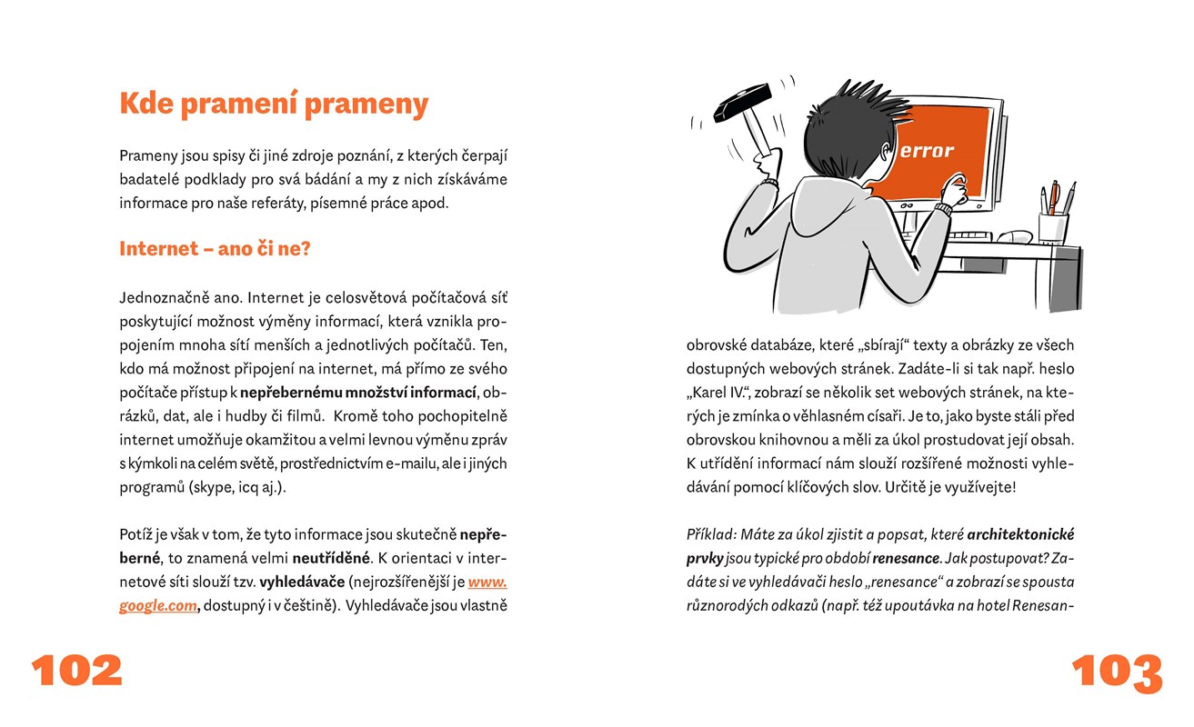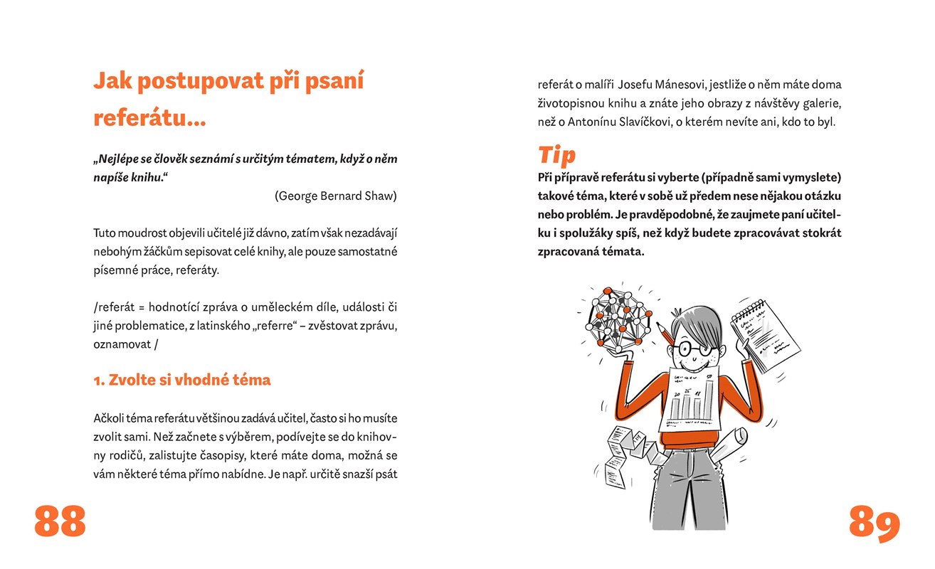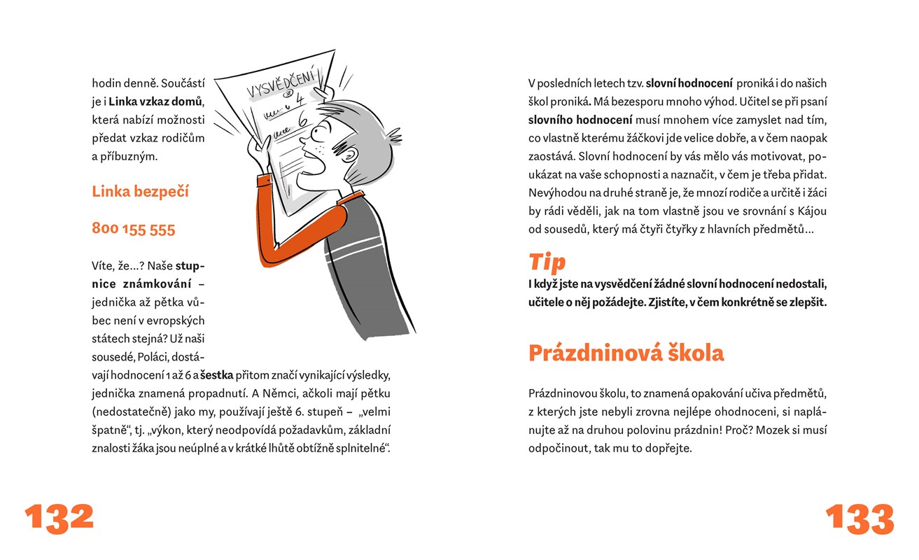 Zábavná a poutavá příručka pro všechny, kdo zatím ještě nezjistili, že škola je vlastně jedno velké zajímavé dobrodružství! V několika kapitolách najdete konkrétní rady, jak dobře vycházet s učiteli a spolužáky (nebo spolužačkami), jak poznat, zda vás někdo klame, zda se paní učitelka zlobí „jen na oko“, nebo doopravdy, a další tajuplné signály řeči těla, která je podobně důležitá jako řeč slov. Dovíte se, že „učit se“ se dá naučit, a seznámíme vás s jednoduchými, v praxi ověřenými postupy a tipy, jak se připravovat na vyučování, jak pracovat s prameny a zdroji informací a vyhledávat je – zkrátka jak obstát ve škole s úspěchem.