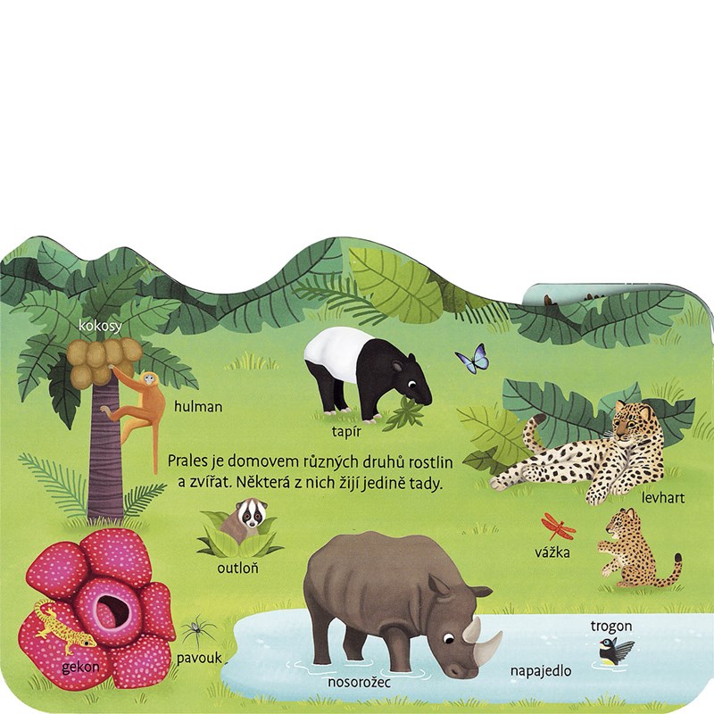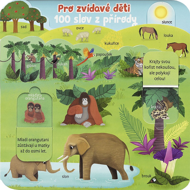 Tato knížka hravou formou napomůže rozvíjení slovní zásoby, zlepšení jemné motoriky a procvičování pozornosti dítěte. Společně poznávejte zvířátka v lese, na poušti, v polárních krajích, v pralese, na farmě i v moři. Objevujte zajímavé informace pod otevíracími okénky a hledejte vysouvací obrázky!