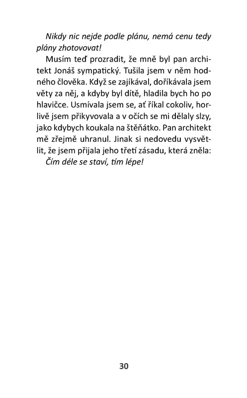Pro všechny optimisty, kteří se aspoň jednou stěhovali, aspoň jednou rekonstruovali, stavěli, neustále něco opravovali, milovali a trápili se. A pro všechny, kteří se pořád smějí, i když si to teda představovali úplně jinak.