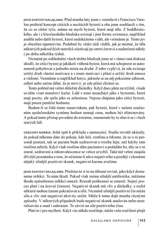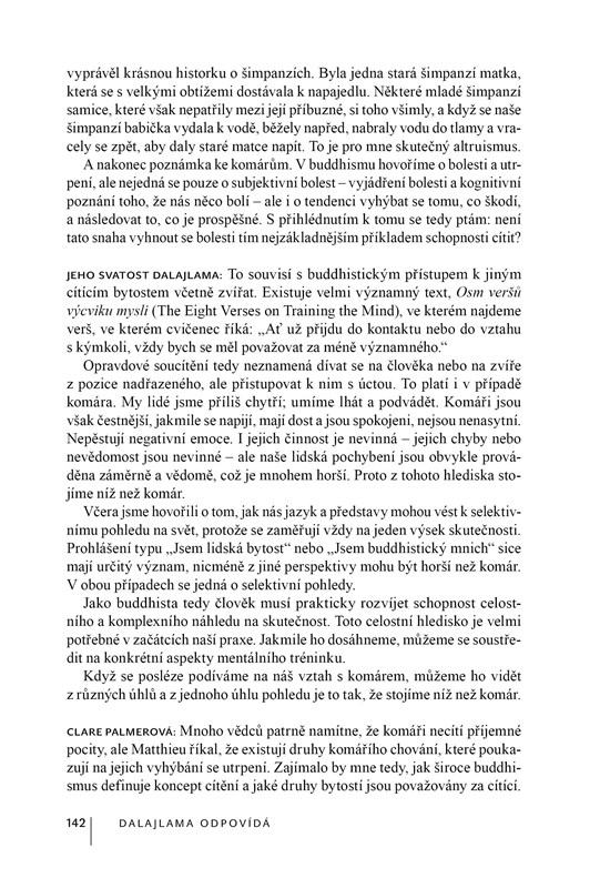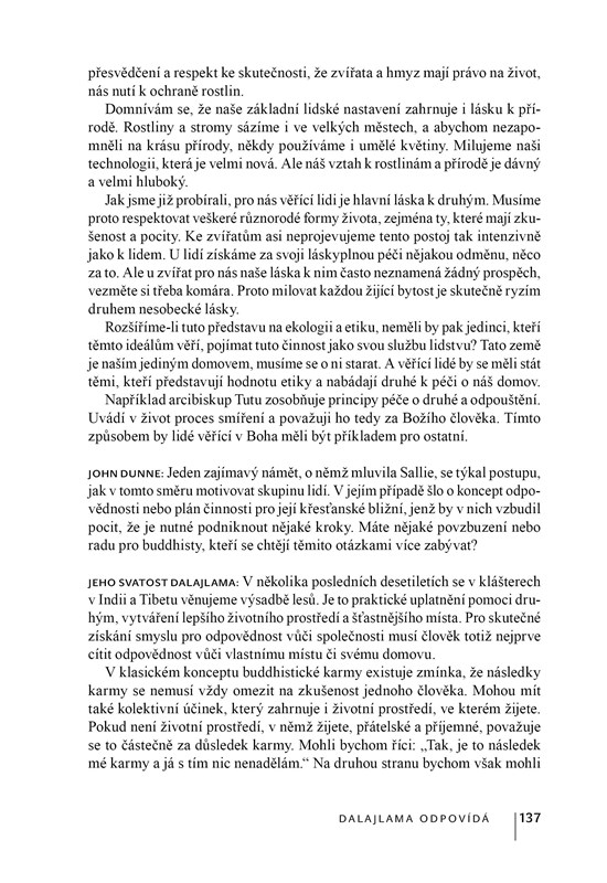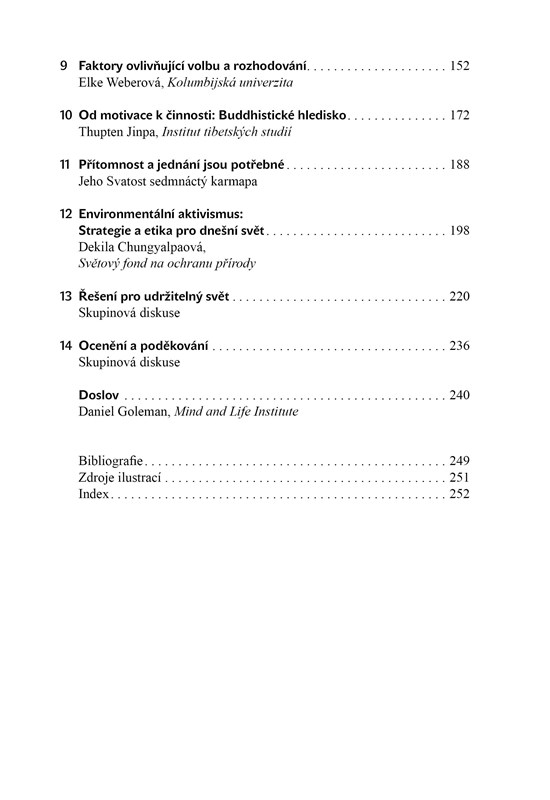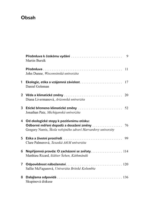 Zajímá vás etická stránka odpovědnosti za životní prostředí, včetně naší odpovědnosti vůči budoucím generacím? Jak vypočítat ekologickou stopu výrobků a služeb? Co dělat s rostoucí konzumací masa, která má negativní dopad na klima a navíc způsobuje utrpení? Jak čelit závratnému konzumerismu, jenž je de facto motorem ekologické krize? Jaká je role médií v této věci? Jak komunikovat ekologickou krizi a získat pro její řešení veřejnost? A jakou roli mají pozitivní a negativní emoce, respektive zprávy? Na tyto a další palčivé otázky dneška hledal odpovědi Jeho Svatost dalajlama v rámci týdenní konference věnované změně klimatu. Jeho hosty byli přední klimatologové, specialisté na lidské zdraví, ale i ekologičtí aktivisté a představitelé buddhismu i křesťanství. Kniha má přitažlivou formu dialogu, ve kterém se zasvěcení odborníci navzájem doplňují, dalajlama vstupuje do hovoru a obohacuje jej o vlastní myšlenky.