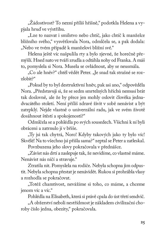 Nora svými přednáškami a knihami motivuje druhé, jak žít naplno. Po tragickém pádu ze sedmého patra se dokázala symbolicky odrazit ode dna a její manželství i kariéra dostaly nový impuls. Pak ale začala psát o sedmi smrtelných hříších… a naproti jejich domu se přistěhovala nová sousedka.