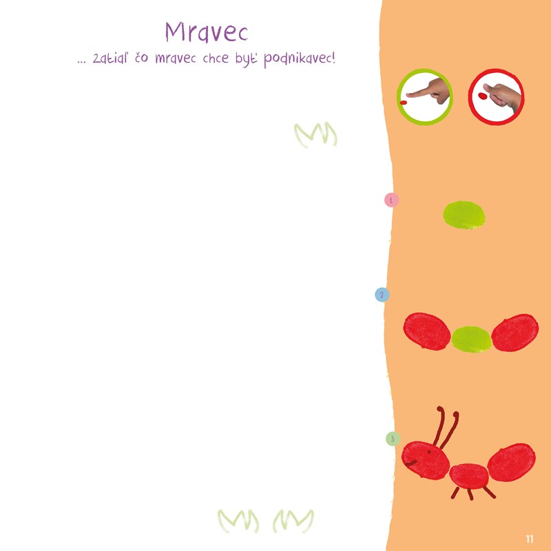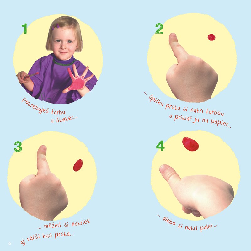 So svojimi prstami a rukami dokážeš jednoducho vytvoriť psa a mačku, pštrosa alebo kraba, či dokonca gazelu a nosorožca... Na každej strane tejto knihy sa nachádza predloha rozdelená do štyroch krokov. Priprav si farby, rozcvič prsty a staň sa maliarom!