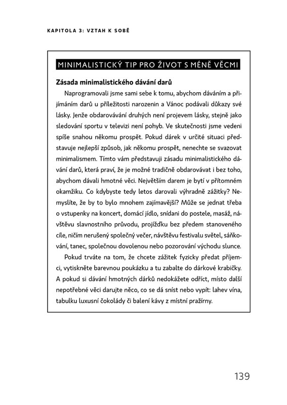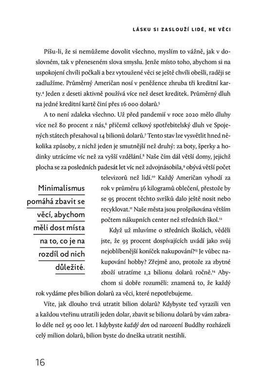 Nikdy dřív v historii nebyli lidé tolik zahlceni věcmi jako dnes. Často kvůli tomu zanedbávají své blízké. Světově proslulá dvojice The Minimalists v této knize zkoumá, jak se nám život a vztahy zlepší, poté co se zbavíme materiálních přežitků. Především ale ukazují, jak přehodnotit a napravit sedm důležitých oblastí našich životů: vztah k věcem, pravdě, sobě, penězům, hodnotám, tvořivosti a lidem. Vycházejí přitom z vlastních zážitků i zkušeností dalších zastánců minimalismu a předkládají čtenářům praktický návod, jak žít plnohodnotně a smysluplně.