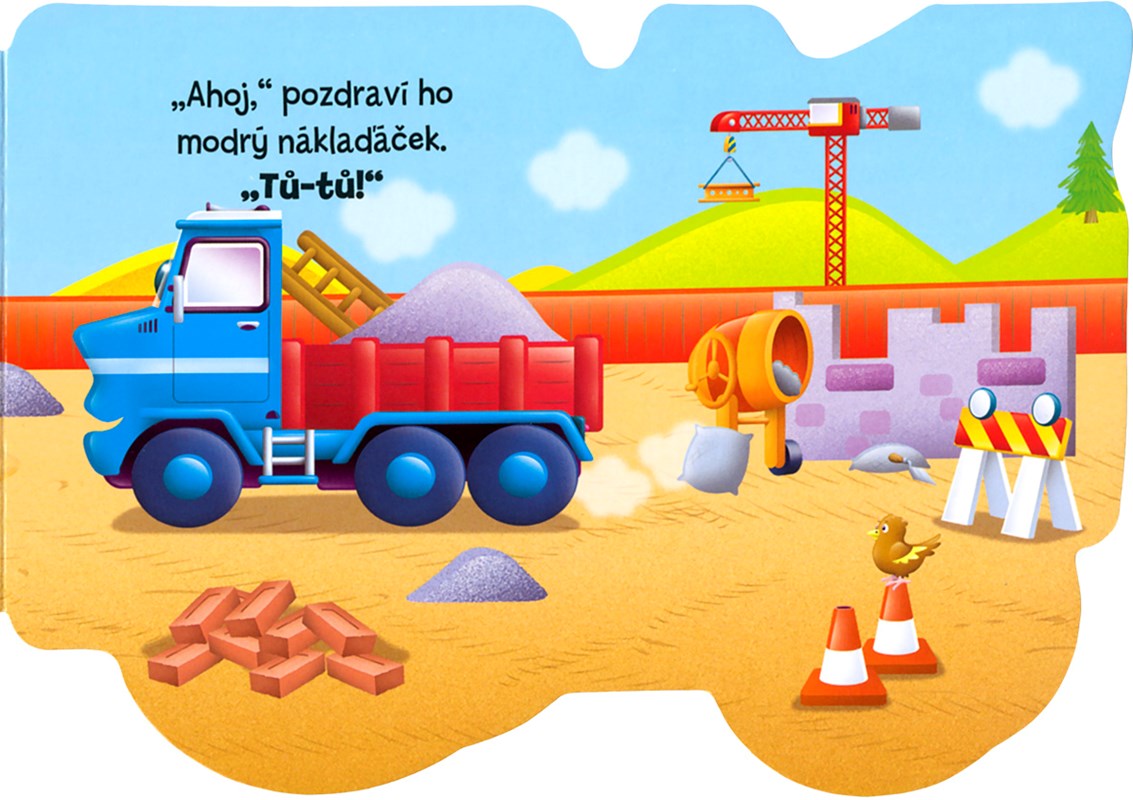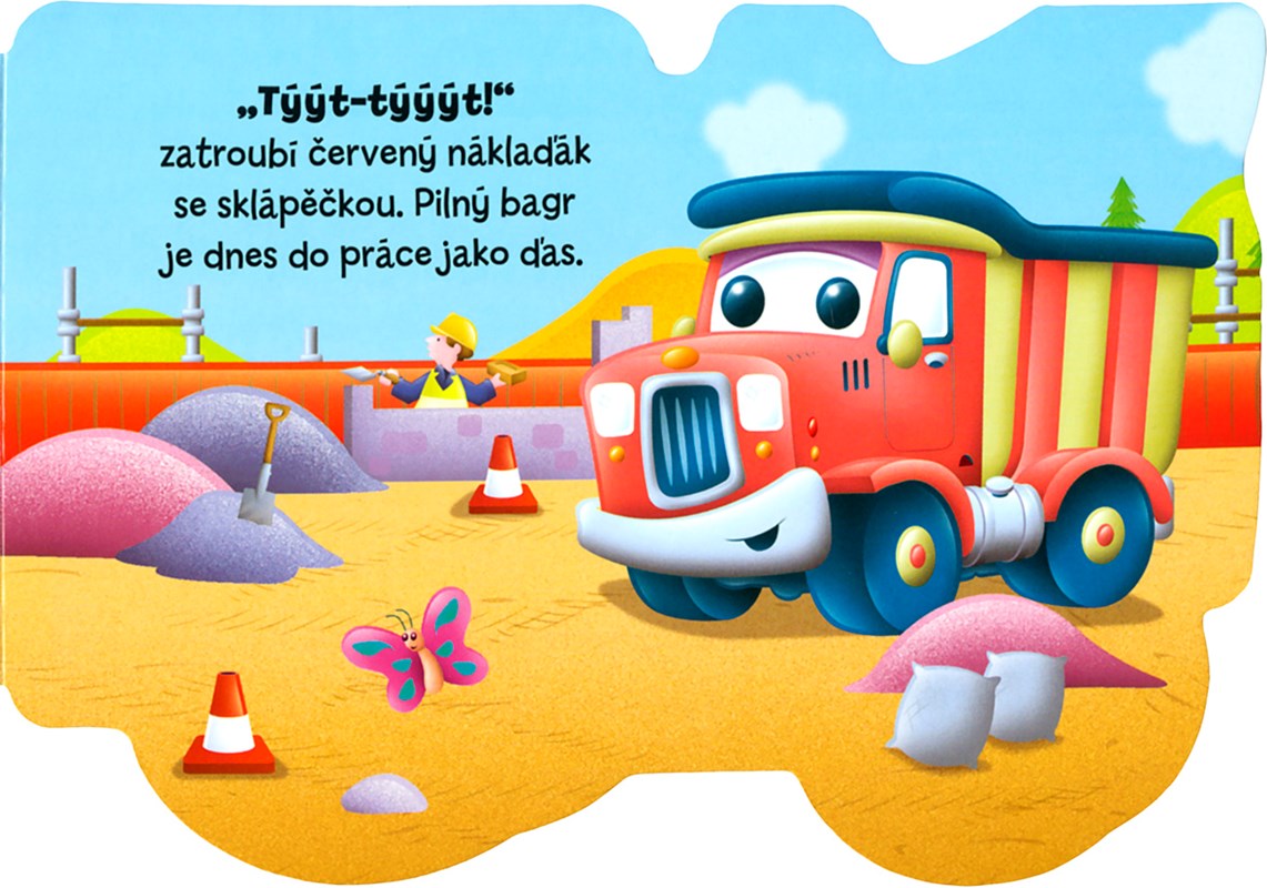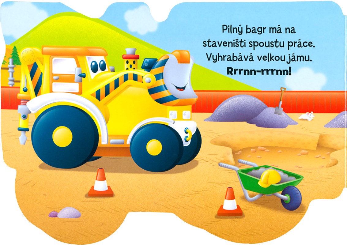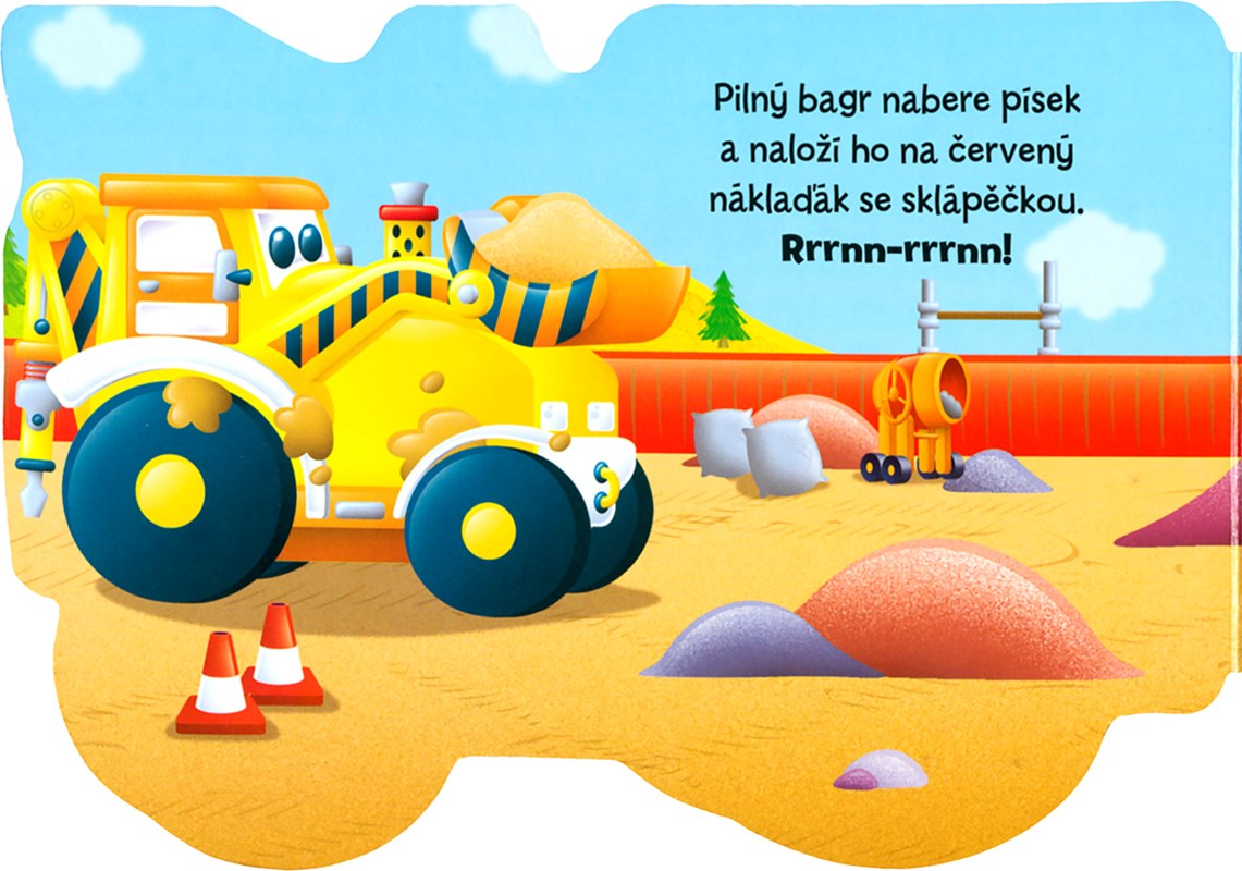 Pilný bagr má na staveništi spoustu práce. Je silný a rád pomáhá svým kamarádům. Čtěte si o tom, komu nakládá písek a komu zase cihly, a říkejte, co vidíte na obrázcích.