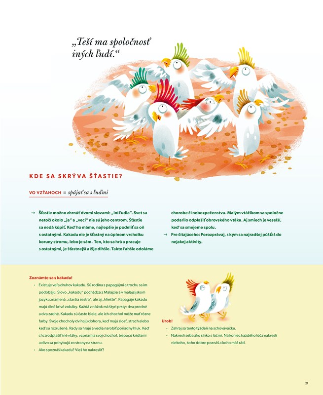 Kamarátsky kakadu, štedrý hoko či citlivý plameniačik objavili, že radosť a šťastie netreba úmorne dolovať, ale že sa skrývajú v každodenných drobnostiach.