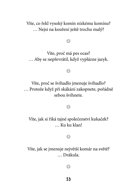 Tato kniha plná vtipů udělá radost všem. Ať už se začtete do vtipů o Pepíčkovi, ze školy, o prarodičích, z pohádek nebo dalších, pořádně se zasmějete a budete mít dobrou náladu.