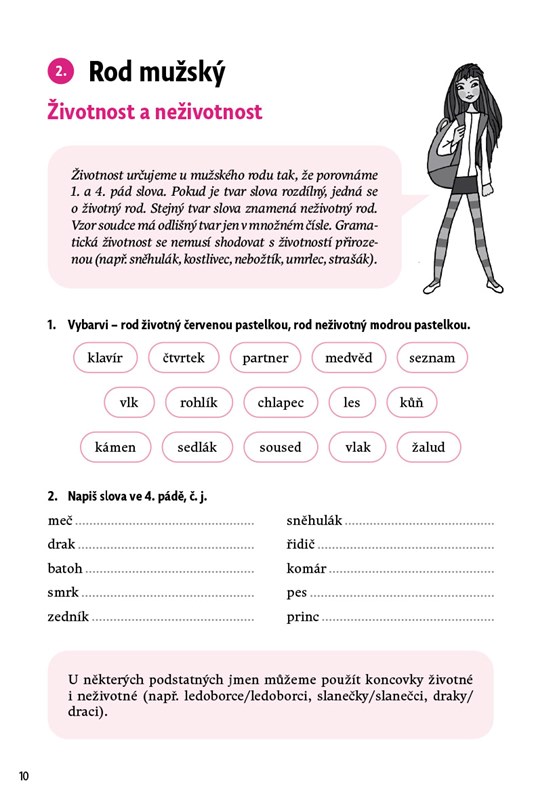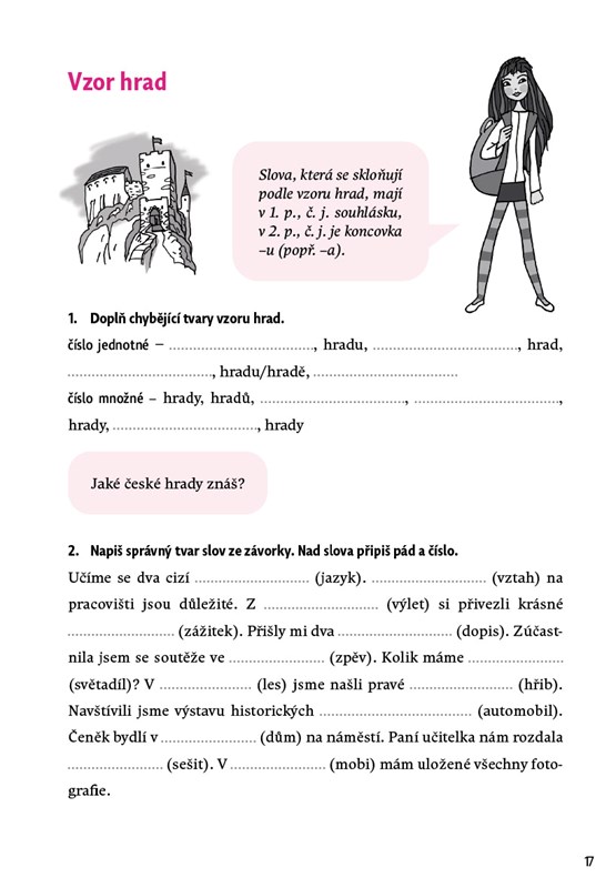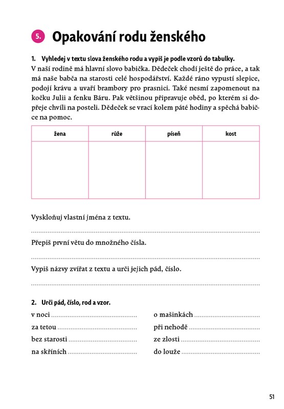 Látka je řazena do kapitol podle jednotlivých vzorů podstatných jmen. Děti mohou pracovat samostatně podle svého tempa a potřeb. Nechybí shrnující opakování a klíč správných řešení.
