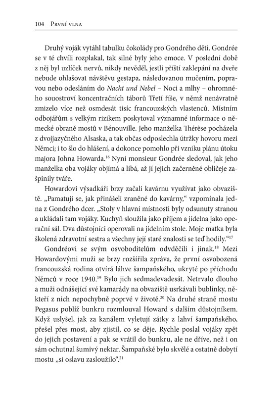 Děj První vlny začíná za rozbřesku 5. června 1944 v místnosti, kde padlo ono finální rozhodnutí. Sleduje příběhy mužů, na jejichž ramenou spočíval úspěch následujícího Dne D. Mezi tyto dnes často zapomenuté hrdiny patřil např. první americký výsadkář, který se dotkl půdy v Normandii, pilot kluzáku, jenž přes protiletadlovou palbu nechal dosednout svůj stroj až u životně důležitého mostu Pegasus, bratři vedoucí své jednotky na pláži Juno pod smrtelnou palbou nebo francouzské komando vracející se osvobodit rodnou zemi. Kniha vás nechá zažít hrůzu ostřelovaných normandských pláží, hrdinské dobytí dělostřelecké baterie u Merville, řadu okamžiků, kdy se vše zdálo být ztraceno. Muži „první vlny“ vsadili na nejistou kartu. Svou obětí určili osud invaze do Hitlerovy „pevnosti Evropa“ – a samotného dvacátého století.