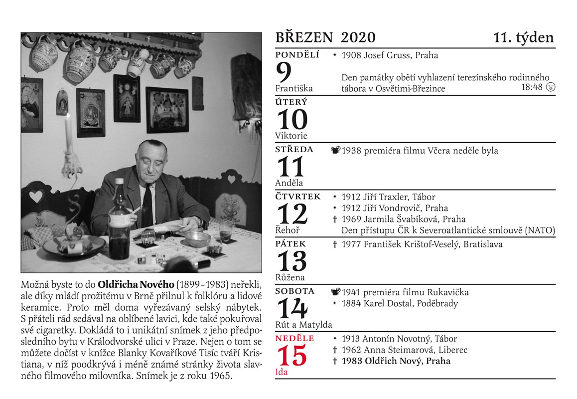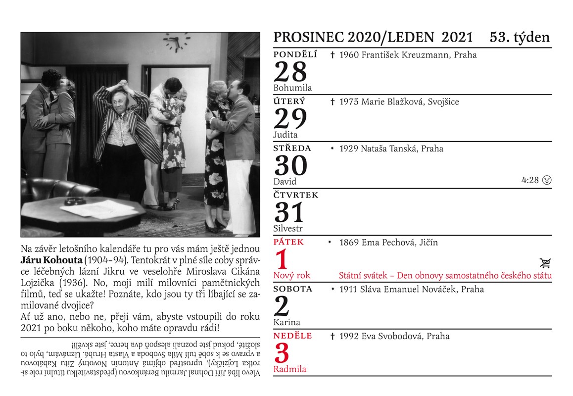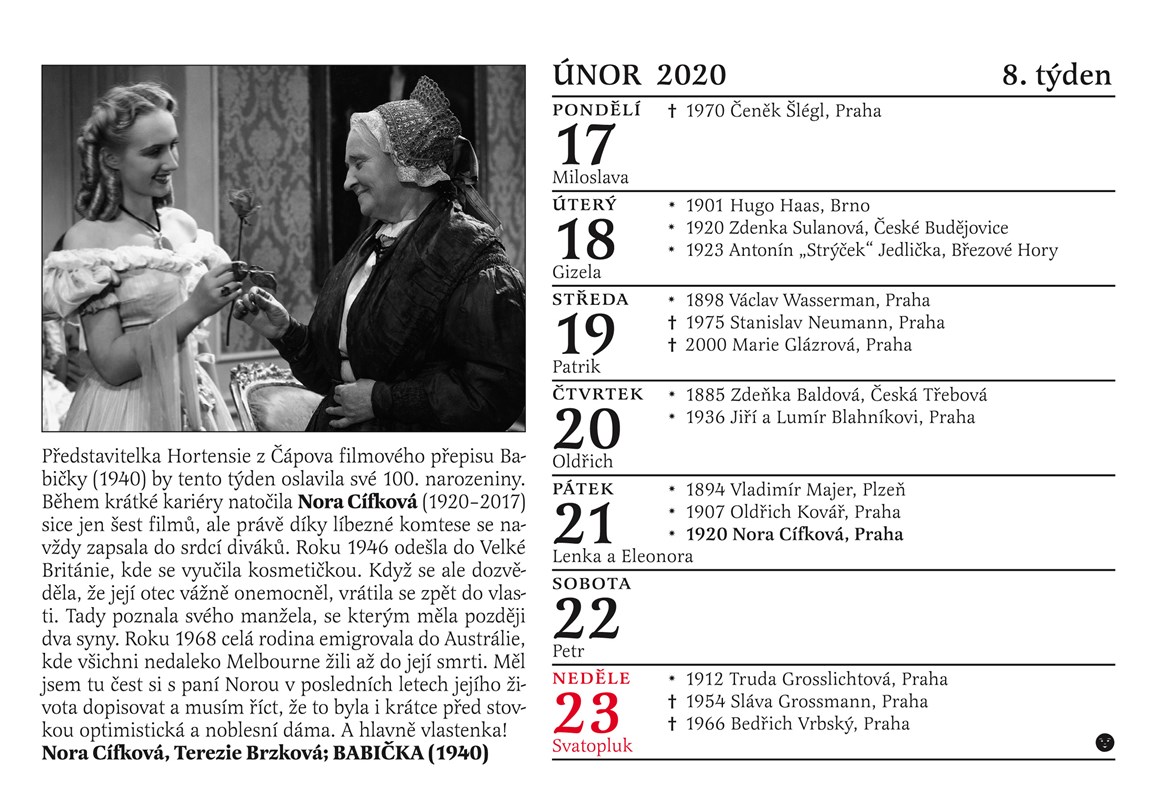 Tradiční Cibulkův kalendář pro pamětníky vychází letos už podvanácté! Jaká byla tajná vášeň Oldřicha Nového? Co ráda mlsala Nataša Gollová? Které osobnosti jsme na vaše četné žádosti doplnili? Které pamětnické hvězdy by v roce 2020 oslavily své sté narozeniny? Jak vypadaly Růžena Nasková a Antonie Nedošinská jako mladičké dívky? Který byl opravdu první český zvukový film? Každý den máte dokonalý přehled o narození či úmrtí slavných filmových hvězd 30. a 40. let minulého století, o premiérách nejslavnějších pamětnických filmů, každý týden vás čeká unikátní fotografie doplněná poutavým textem. To vše najdete v Cibulkově kalendáři pro pamětníky na rok 2020. Letos přidáváme unikátní charakteristiku znamení zvěrokruhu podle Luby Skořepové a jako jediný kalendář na trhu vám také přineseme u každého státního svátku praktickou informaci o tom, zda zůstávají obchody otevřené nebo ne.