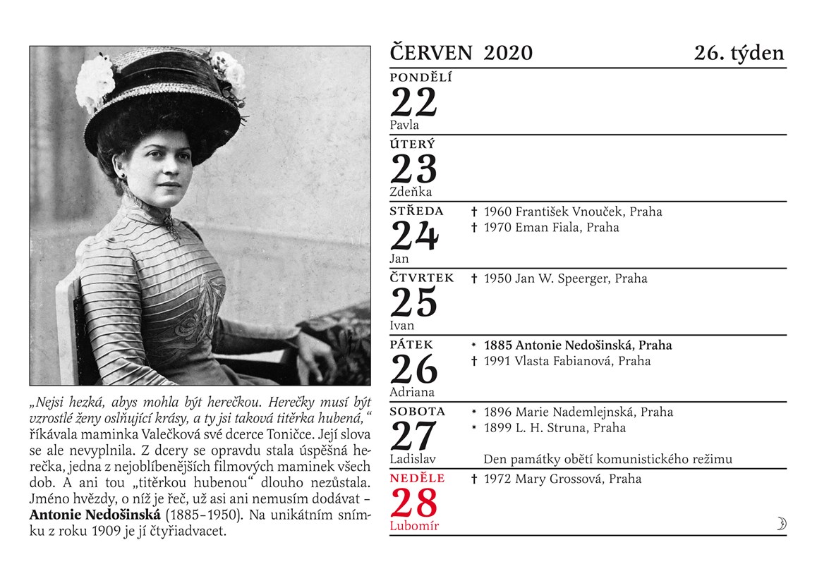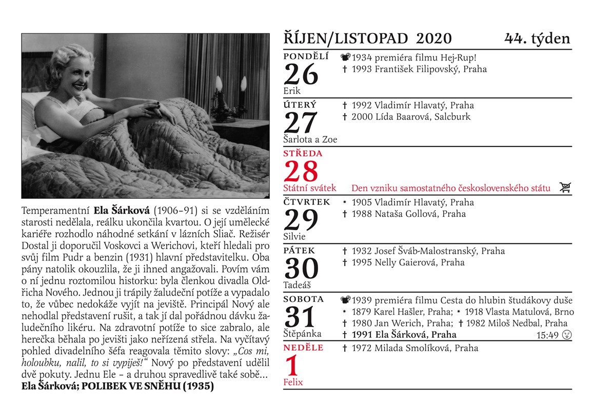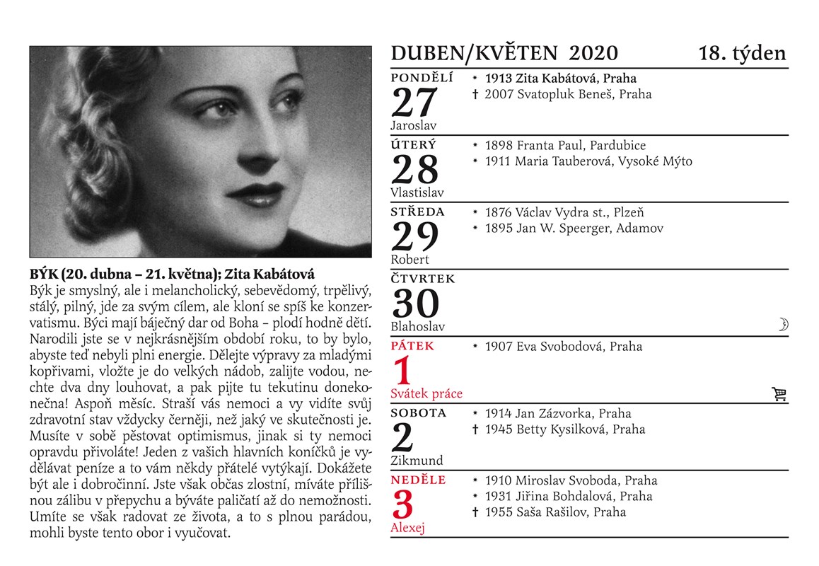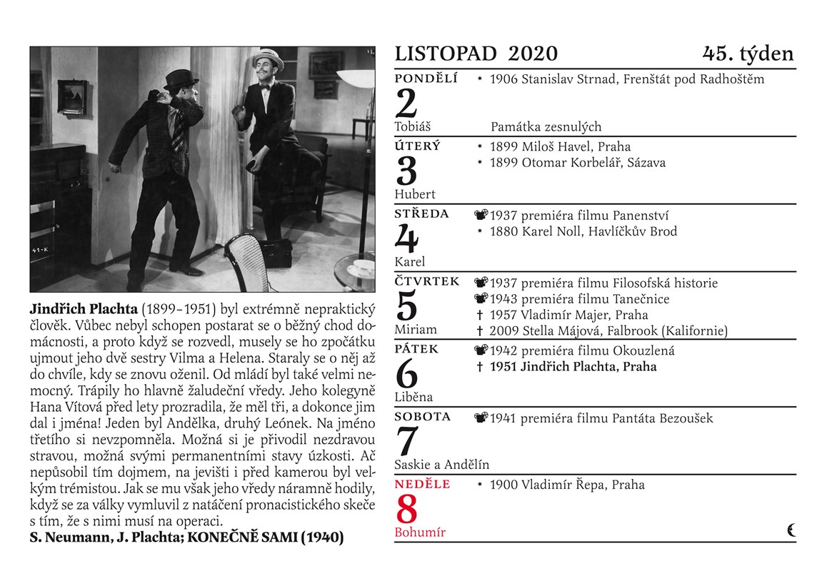 Tradiční Cibulkův kalendář pro pamětníky vychází letos už podvanácté! Jaká byla tajná vášeň Oldřicha Nového? Co ráda mlsala Nataša Gollová? Které osobnosti jsme na vaše četné žádosti doplnili? Které pamětnické hvězdy by v roce 2020 oslavily své sté narozeniny? Jak vypadaly Růžena Nasková a Antonie Nedošinská jako mladičké dívky? Který byl opravdu první český zvukový film? Každý den máte dokonalý přehled o narození či úmrtí slavných filmových hvězd 30. a 40. let minulého století, o premiérách nejslavnějších pamětnických filmů, každý týden vás čeká unikátní fotografie doplněná poutavým textem. To vše najdete v Cibulkově kalendáři pro pamětníky na rok 2020. Letos přidáváme unikátní charakteristiku znamení zvěrokruhu podle Luby Skořepové a jako jediný kalendář na trhu vám také přineseme u každého státního svátku praktickou informaci o tom, zda zůstávají obchody otevřené nebo ne.