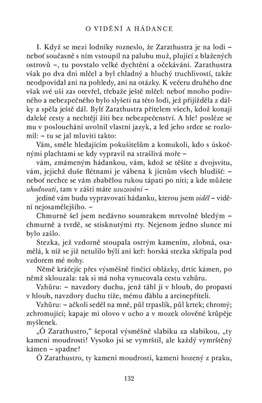 Filolog, filosof a básník Friedrich Nietzsche (1844—1900) patří k největším filosofickým géniům nejen svého 19. století, ale bezpochyby všech dob. On sám své veledílo Tak pravil Zarathustra z roku 1882 považoval neskromně za nejlepší knihu, jaká byla vůbec kdy napsána. Nemusíme s takovým hodnocením souhlasit, ale sotva se ubráníme dojmu, že zde máme před sebou cosi neobyčejného. Svými myšlenkami o smrti Boha, vůli k moci a nadčlověka budil Nietzsche ve své době zděšení a pohoršení, a na vnímavého čtenáře budou znepokojivě působit i dnes – a možná právě dnes. Nejde navíc o suchopárně odborné výklady, těch Nietzsche nikdy nebyl zastáncem, a snad právě v Zarathustrovi dovedl k dokonalosti žánr filosofické básně. Díky kongeniálnímu a dnes již klasickému překladu Otokara Fischera (+ 1938) máme možnost okusit sílu tohoto textu i v českém jazyce. Kniha je doprovázena ilustracemi význačného českého výtvarníka Oldřicha Kulhánka, inspirovanými Nietzscheho Zarathustrou. Nové vydání je tak zároveň poctou tomuto nedávno zesnuvšímu umělci, jehož autorský rukopis je přinejmenším díky jeho grafickému návrhu českých bankovek znám každému. Kniha vychází již tradičně ve skvělém překladu Otokara Fischera.