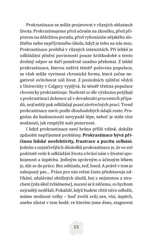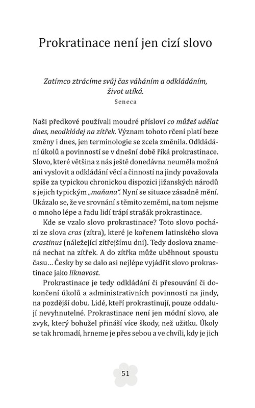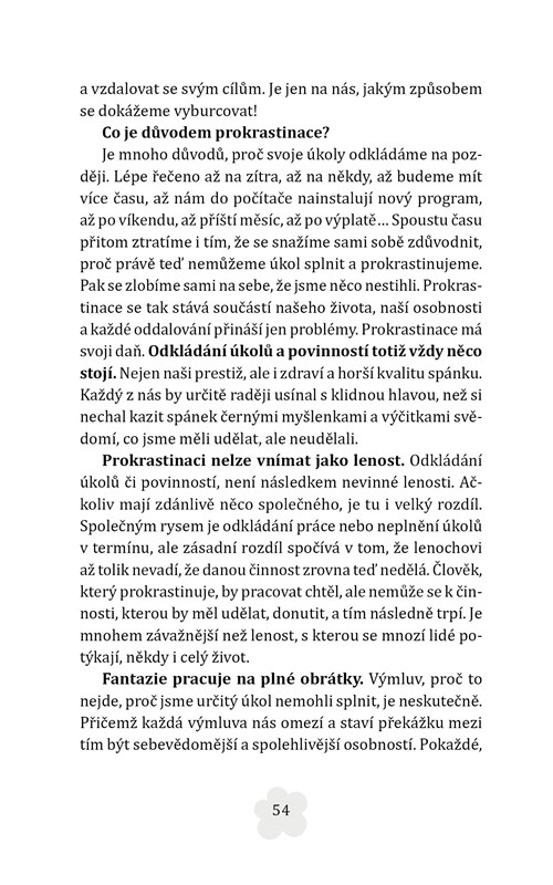 Smyslem této praktické příručky je pochopit, jak a proč ztrácíme náš drahocenný čas, proč prokrastinujeme a nic nestíháme. Knížka je plná užitečných metod, rad a tipů, jak lze lépe čas využívat, jak efektivně zvládat všechny úkoly a povinnosti a být vysoce produktivní. Zkušená autorka Jarmila Mandžuková čtenářům nabízí nástroje a postupy, pomocí kterých můžou získat návyky efektivního nakládání s časem. Budou mít potom více volného času, který mohou věnovat tomu, co je opravdu baví. To zákonitě povede k tomu, že se budou cítit lépe, budou svobodnější a spokojenější. Cílem autorky není jen to, aby se kniha přečetla, ale hlavně, aby po přečtení knihy čtenář začal na sobě pracovat a vnesl uvedené rady a tipy do svého života. Všechny kapitole jsou uvedeny citáty slavných osobností, které shrnují podstatu věci.
