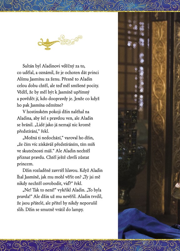 Aladina si všimne vezír Džafar, který baží po vládě nad Agrabahem. Vezme ho k Jeskyni zázraků a rozkáže mu, aby z ní přinesl starou lampu. Lampa je kouzelná a džin v ní zakletý musí svému pánovi splnit tři přání. Když však lampa připadne Aladinovi, pohádkové dobrodružství může začít!