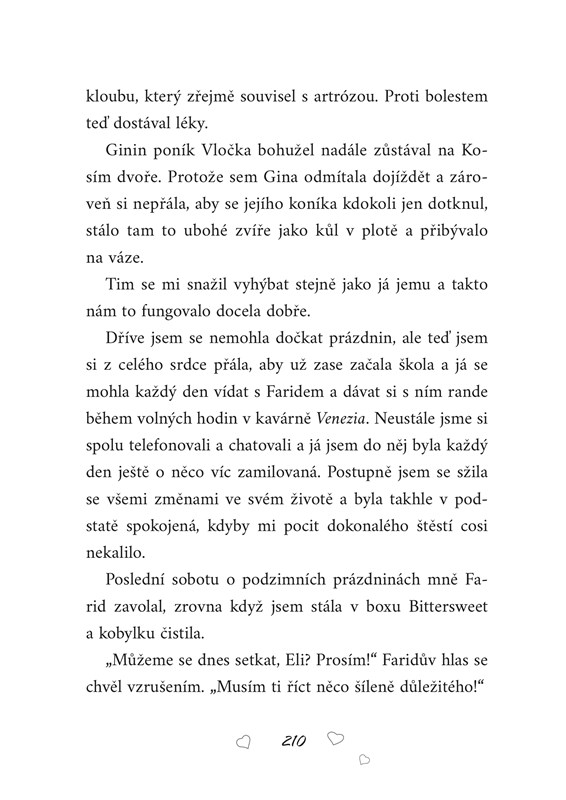Co se to jen s Timem děje? Od Elenina návratu z Ameriky je jako vyměněný a ona už vůbec neví, na čem vlastně je. Když Elena na posledním turnaji v sezoně spadne z koně a těžce se zraní, není to Tim, kdo ji navštíví v nemocnici, nýbrž Farid. Ovšem proč by se měl tento krásný kluk, navíc vycházející fotbalová hvězda, zamilovat zrovna do ní?