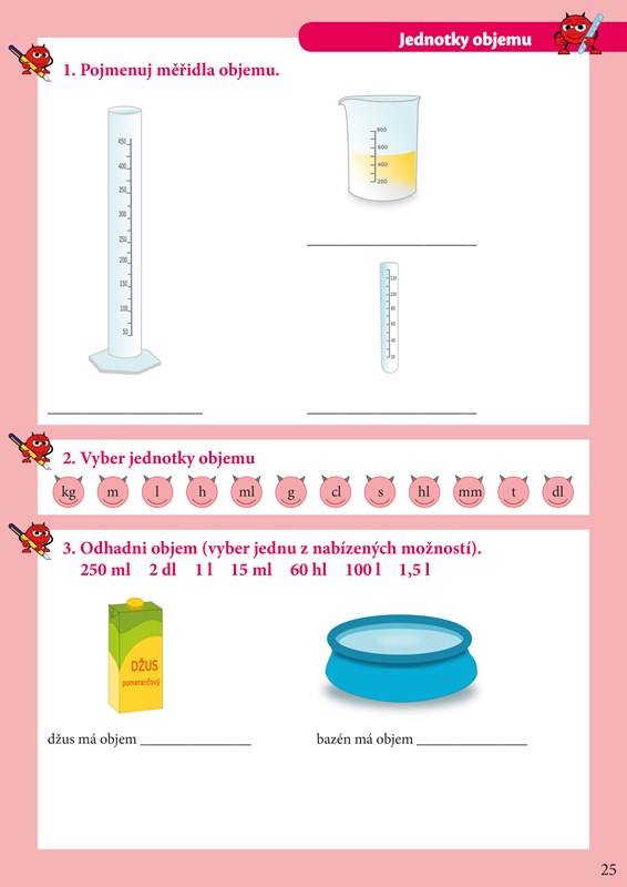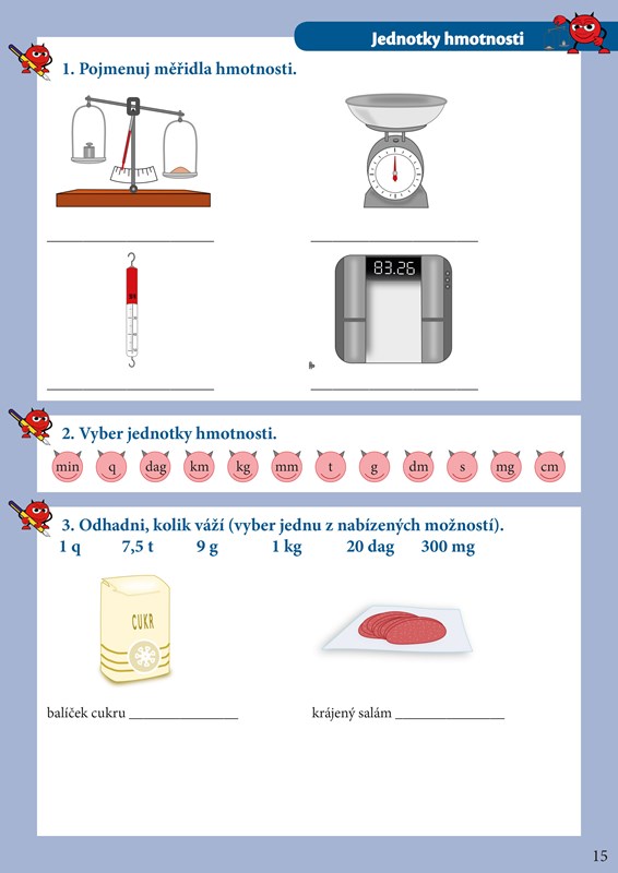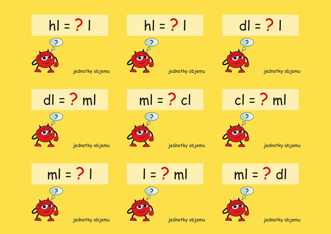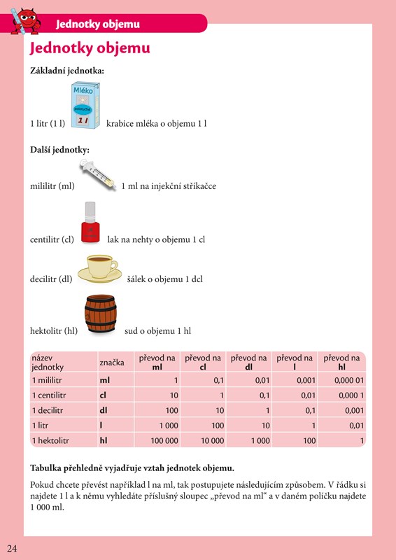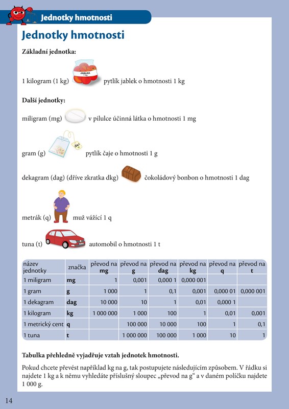 A zase se celý třese na to, až vám bude pomáhat s učením. Čertík se teď v hodinách matematiky učí převádět jednotky, a tak dobře ví, že je to pěkná dřina. Čertík už ale spěchá za vámi, aby všechno vysvětlil. Vyčaroval pro vás kouzelné karty, díky kterým vám půjde učení pekelně snadno. Karty najdete v příloze cvičebnice. Vystřihněte je a hned se můžete pustit do učení. Každá kartička vás učí, jak při převádění jednotek postupovat. Karty si budete postupně procházet a ty, které ještě neumíte, odložíte stranou a vrátíte se k nim později. Za chvilku určitě budete umět převádět jednotky bez sebemenšího zaváhání. To by v tom byl čert, abychom to spolu nezvládli!