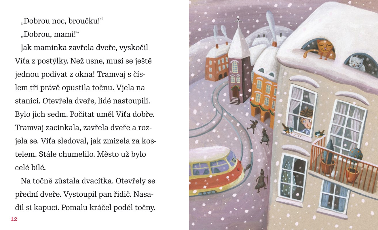 Venku sněží, prvňáček Víťa se těší na Ježíška a na tatínka, který se vrací domů z daleké ciziny. Vánoce oslaví všichni tři spolu! Večer, než Víťa usne, ještě vyskočí z postýlky, aby se podíval na konečnou stanici pod okny. Víťa má totiž rád tramvaje – a zrovna jedna přijíždí! Když zastaví, pan řidič vystoupí, jde k blízkému křoví a jakoby s někým mluví. Druhý den se vše opakuje. Kdo se skrývá v houští? A co se Víťovi přihodí v čarovném předvánočním čase?