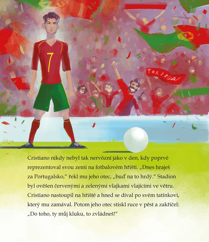Vydejte se za krásným fotbalovým dobrodružstvím. Hrdina našeho příběhu se jmenuje Cristiano Ronaldo a možná jste ho už viděli v televizi, je totiž zářivou fotbalovou hvězdou. Ale znáte jeho skutečný životní příběh? Cristiano, rodák z ostrova Madeira, vyrůstal v chudé rodině. Jako dítě nejprve neměl ani pořádný míč, kopal si jen s vlastnoručně vyrobeným hadrovým balónem. Díky talentu a píli se však neustále zlepšoval a po čase o něj projevily zájem velké fotbalové kluby. A tím započala jeho cesta, která vedla z malého ostrova až do Realu Madrid. Seznamte se s legendou, poznejte Cristiana Ronalda.